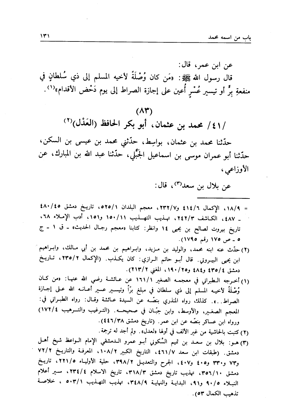 حَدَّثَنَا مُحَمَّدُ بْنُ عُثْمَانَ بِوَاسِطَ، حَدَّثَنِي مُحَمَّدُ بْنُ عِيسَى بْنِ السَّكَنِ، حَدَّثَنَا أَبُو عِمْرَانَ مُوسَى بْنُ إِسْمَاعِيلَ الْجَبَلِيُّ، حَدَّثَنَا عَبْدُ اللَّهِ بْنُ الْمُبَارَكِ، عَنِ الْأَوْزَاعِيِّ، عَنْ بِلَالِ بْنِ سَعْدٍ، قَالَ -[132]-: §«لَا تَنْظُرْ إِلَى صِغَرِ الْخَطِيئَةِ وَلَكِنِ انْظُرْ مَنْ عَصَيْتَ»