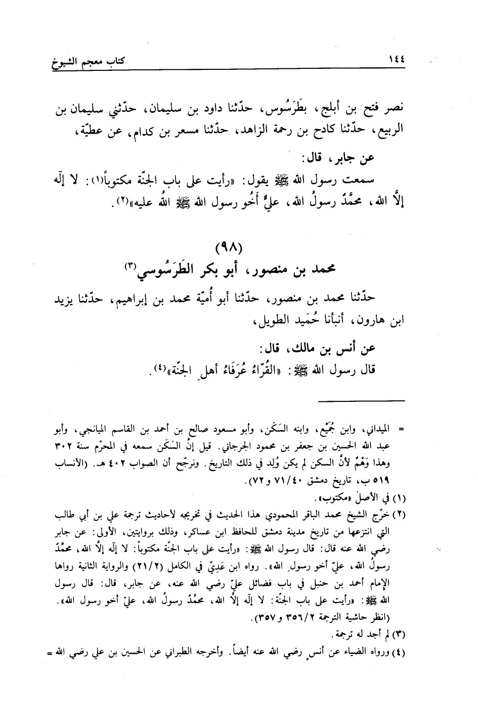حَدَّثَنَا مُحَمَّدُ بْنُ مَنْصُورٍ، حَدَّثَنَا أَبُو أُمَيَّةَ مُحَمَّدُ بْنُ إِبْرَاهِيمَ، حَدَّثَنَا يَزِيدُ بْنُ هَارُونَ، أَنْبَأَنَا حُمَيْدٌ الطَّوِيلُ، عَنْ أَنَسِ بْنِ مَالِكٍ، قَالَ: قَالَ رَسُولُ اللَّهِ صَلَّى اللهُ عَلَيْهِ وَسَلَّمَ: §«الْقُرَّاءُ عُرَفَاءُ أَهْلِ الْجَنَّةِ»