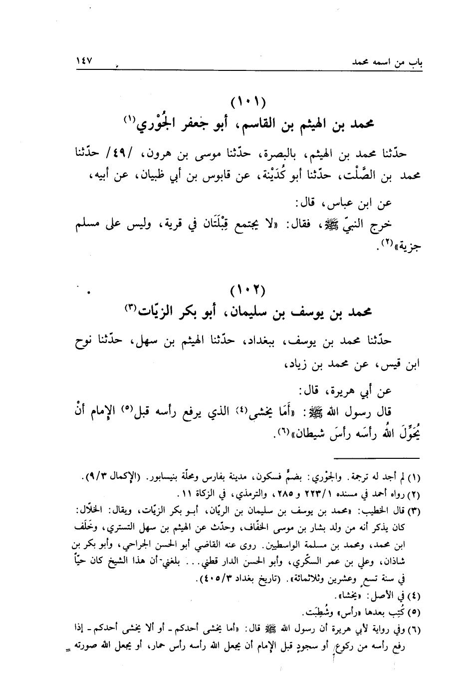 حَدَّثَنَا مُحَمَّدُ بْنُ يُوسُفَ بِبَغْدَادَ، حَدَّثَنَا الْهَيْثَمُ بْنُ سَهْلٍ، حَدَّثَنَا نُوحُ بْنُ قَيْسٍ، عَنْ مُحَمَّدِ بْنِ زِيَادٍ، عَنْ أَبِي هُرَيْرَةَ، قَالَ: قَالَ رَسُولُ اللَّهِ صَلَّى اللهُ عَلَيْهِ وَسَلَّمَ: §«أَمَا يَخْشَى الَّذِي يَرْفَعُ رَأْسَهُ قَبْلَ الْإِمَامِ أَنْ يُحَوِّلَ اللَّهُ رَأْسَهُ رَأْسَ شَيْطَانٍ»