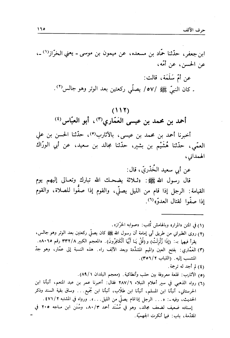 أَخْبَرَنَا أَحْمَدُ بْنُ مُحَمَّدِ بْنِ عِيسَى بِالْأَثَارِبِ، حَدَّثَنَا الْحَسَنُ بْنُ عَلِيٍّ الْعَمِّيُّ، حَدَّثَنَا هُشَيْمُ بْنُ بَشِيرٍ، حَدَّثَنَا مُجَالِدُ بْنُ سَعِيدٍ، عَنْ أَبِي الْوَدَّاكِ الْهَمْدَانِيِّ، عَنْ أَبِي سَعِيدٍ الْخُدْرِيِّ، قَالَ: قَالَ رَسُولُ اللَّهِ صَلَّى اللهُ عَلَيْهِ وَسَلَّمَ: «§ثَلَاثَةٌ يَضْحَكُ اللَّهُ تَبَارَكَ وَتَعَالَى إِلَيْهِمْ يَوْمَ الْقِيَامَةِ، الرَّجُلُ إِذَا قَامَ مِنَ اللَّيْلِ يُصَلِّي، وَالْقَوْمُ إِذَا صَفُّوا لِلصَّلَاةِ، وَالْقَوْمُ إِذَا صَفُّوا لِقِتَالِ الْعَدُوِّ»