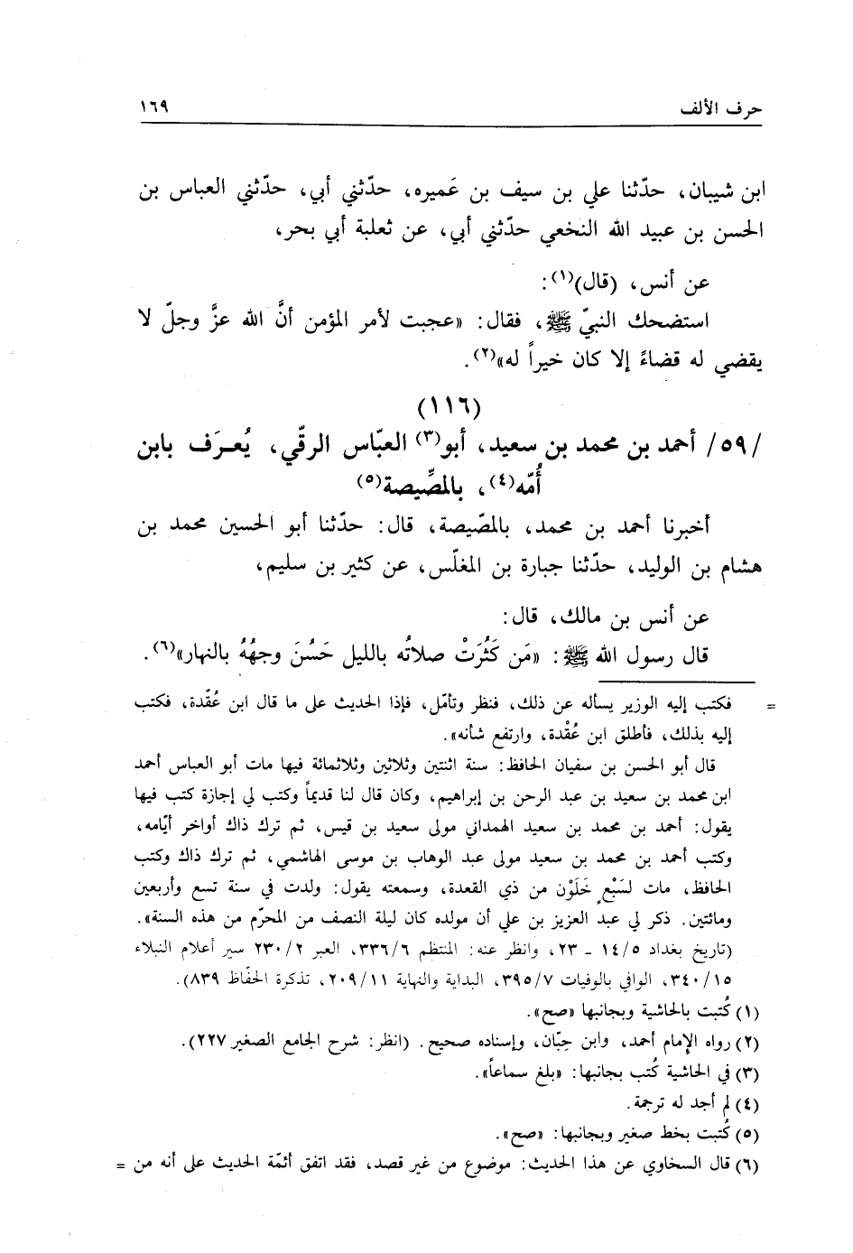 أَخْبَرَنَا أَحْمَدُ بْنُ مُحَمَّدٍ بِالْمِصِّيصَةِ، قَالَ: حَدَّثَنَا أَبُو الْحُسَيْنِ مُحَمَّدُ بْنُ هِشَامِ بْنِ الْوَلِيدِ، حَدَّثَنَا جُبَارَةُ بْنُ الْمُغَلِّسِ، عَنْ كَثِيرِ بْنِ سُلَيْمٍ، عَنْ أَنَسِ بْنِ مَالِكٍ، قَالَ: قَالَ رَسُولُ اللَّهِ صَلَّى اللهُ عَلَيْهِ وَسَلَّمَ: §«مَنْ كَثُرَتْ صَلَاتُهُ بِاللَّيْلِ حَسُنَ وَجْهُهُ بِالنَّهَارِ»