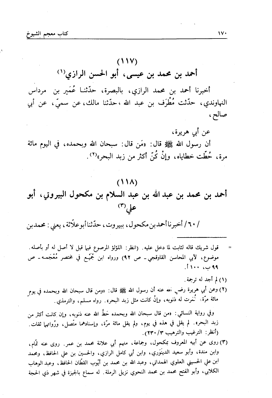 أَخْبَرَنَا أَحْمَدُ بْنُ مُحَمَّدٍ الرَّازِيُّ بِالْبَصْرَةِ، حَدَّثَنَا عُمَيْرُ بْنُ مِرْدَاسٍ النَّهَاوَنْدِيُّ، حَدَّثْتُ مُطَرِّفَ بْنَ عَبْدِ اللَّهِ، حَدَّثَنَا مَالِكٌ، عَنْ سُمَيٍّ، عَنْ أَبِي صَالِحٍ، عَنْ أَبِي هُرَيْرَةَ، أَنَّ رَسُولَ اللَّهِ صَلَّى اللهُ عَلَيْهِ وَسَلَّمَ، قَالَ: " §مَنْ قَالَ: سُبْحَانَ اللَّهِ وَبِحَمْدِهِ فِي الْيَوْمِ مِائَةَ مَرَّةٍ حُطَّتْ خَطَايَاهُ وَإِنْ كُنَّ أَكْثَرَ مِنْ زَبَدِ الْبَحْرِ "