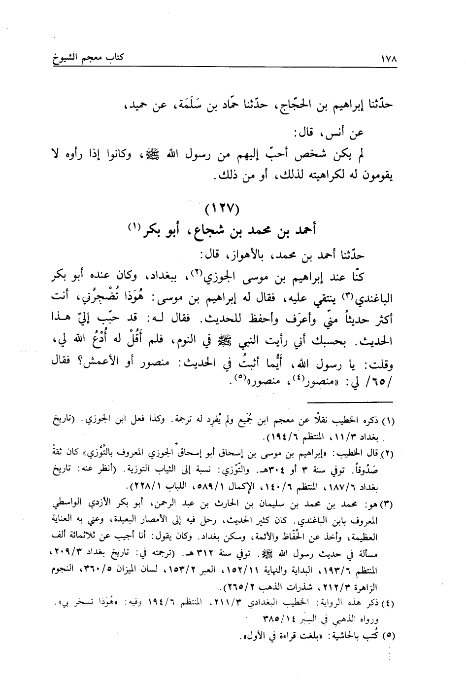 §أَحْمَدُ بْنُ مُحَمَّدِ بْنِ شُجَاعٍ أَبُو بَكْرٍ حَدَّثَنَا أَحْمَدُ بْنُ مُحَمَّدٍ بِالْأَهْوَازِ، قَالَ: كُنَّا عِنْدَ إِبْرَاهِيمَ بْنِ مُوسَى الْجَوْزِيِّ بِبَغْدَادَ، وَكَانَ عِنْدَهُ أَبُو بَكْرٍ الْبَاغِنْدِيُّ يَنْتَقِي عَلَيْهِ، فَقَالَ لَهُ إِبْرَاهِيمُ بْنُ مُوسَى: هُوَ ذَا تُضْجِرُنِي، أَنْتَ أَكْثَرُ حَدِيثًا مِنِّي وَأَعْرِفُ وَأَحْفَظُ لِلْحَدِيثِ، فَقَالَ لَهُ: قَدْ حَبِّبْ إِلَيَّ هَذَا الْحَدِيثُ، بِحَسْبِكَ أَنِّي رَأَيْتُ النَّبِيَّ صَلَّى اللهُ عَلَيْهِ وَسَلَّمَ فِي النَّوْمِ فَلَمْ أَقُلْ لَهُ: ادْعُ اللَّهَ لِي، وَقُلْتُ: يَا رَسُولَ اللَّهِ، أَيُّمَا أَثْبَتُ فِي الْحَدِيثِ، مَنْصُورٌ أَوِ الْأَعْمَشُ، فَقَالَ لِي: مَنْصُورٌ مَنْصُورٌ