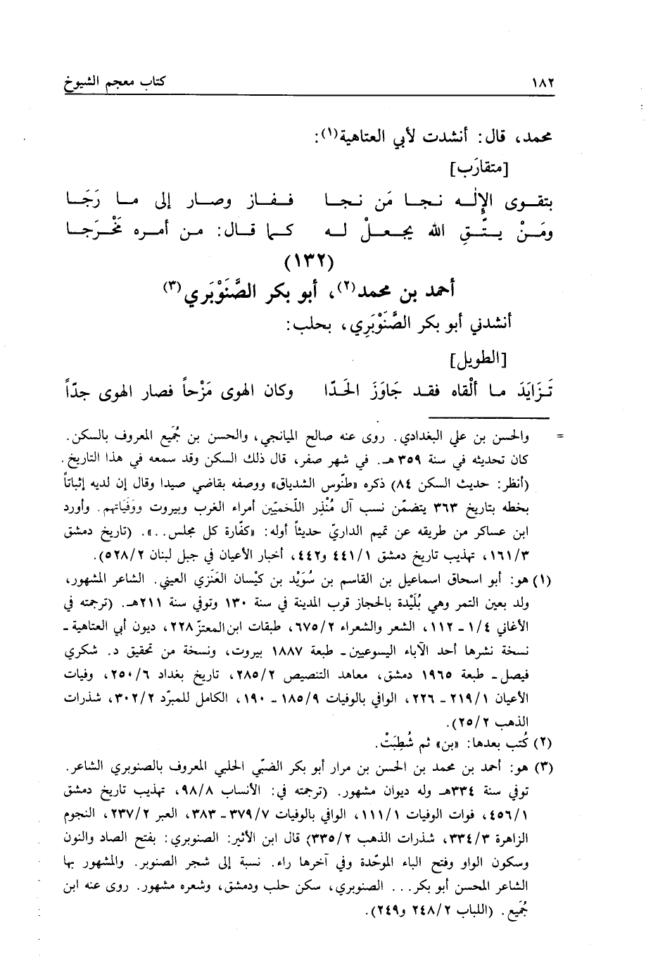 أَنْشِدْنِي أَبُو بَكْرٍ الصَّنَوْبَرِيُّ بِحَلَبَ: «