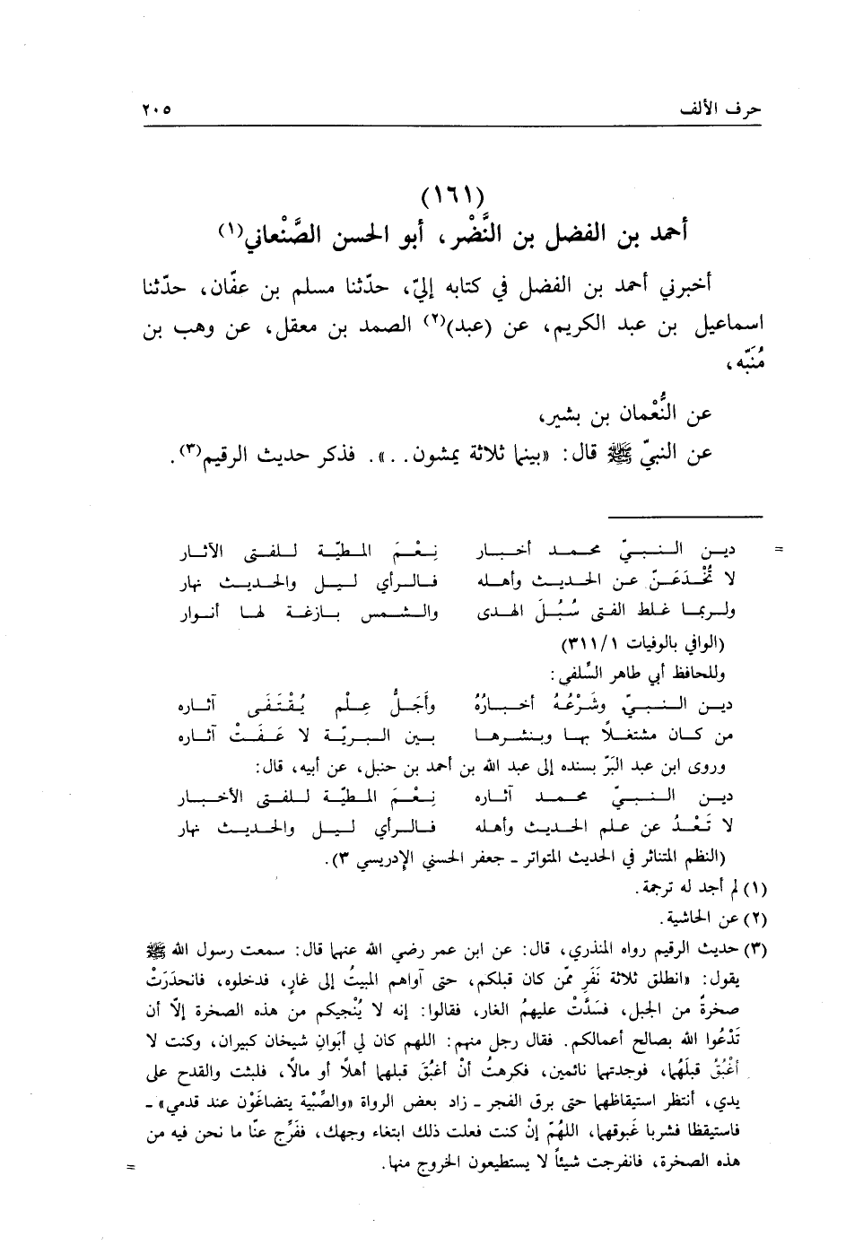 §أَحْمَدُ بْنُ الْفَضْلِ بْنِ النَّضْرِ أَبُو الْحَسَنِ الصَّنْعَانِيُّ أَخْبَرَنِي أَحْمَدُ بْنُ الْفَضْلِ، فِي كِتَابِهِ إِلَيَّ، حَدَّثَنَا مُسْلِمُ بْنُ عَفَّانَ، حَدَّثَنَا إِسْمَاعِيلُ بْنُ عَبْدِ الْكَرِيمِ، عَنْ عَبْدِ الصَّمَدِ بْنِ مَعْقِلٍ، عَنْ وَهْبِ بْنِ مُنَبِّهٍ، عَنِ النُّعْمَانِ بْنِ بَشِيرٍ، عَنِ النَّبِيِّ صَلَّى اللهُ عَلَيْهِ وَسَلَّمَ، قَالَ: «بَيْنَمَا ثَلَاثَةٌ يَمْشُونَ» فَذَكَرَ حَدِيثَ الرَّقِيمِ -[206]- حَدَّثَنَاهُ عَبْدُ اللَّهِ بْنُ أَبِي الْخَنْبَشِ، حَدَّثَنَا الطِّهْرَانِيُّ، حَدَّثَنَا إِسْمَاعِيلُ نَحْوَهُ