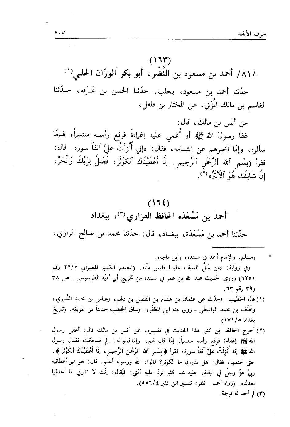 حَدَّثَنَا أَحْمَدُ بْنُ مَسْعُودٍ بِحَلَبَ، حَدَّثَنَا الْحَسَنُ بْنُ عَرَفَةَ، حَدَّثَنَا الْقَاسِمُ بْنُ مَالِكٍ الْمُزَنِيُّ، عَنِ الْمُخْتَارِ بْنِ فُلْفُلٍ، عَنْ أَنَسِ بْنِ مَالِكٍ، قَالَ: غَفَا رَسُولُ اللَّهِ صَلَّى اللهُ عَلَيْهِ وَسَلَّمَ أَوْ أُغْمِيَ عَلَيْهِ إِغْمَاءَةً، فَرَفَعَ رَأْسَهُ مُبْتَسِمًا، فَإِمَّا سَأَلُوهُ، وَإِمَّا أَخْبَرَهُمْ عَنِ ابْتِسَامِهِ، فَقَالَ: «§إِنِّي أُنْزِلَتْ عَلَيَّ آنِفًا سُورَةٌ» قَالَ: فَقَرَأَ: " بِسْمِ اللَّهِ الرَّحْمَنِ الرَّحِيمِ {إِنَّا أَعْطَيْنَاكَ الْكَوْثَرَ، فَصَلِّ لِرَبِّكَ وَانْحَرْ، إِنَّ شَانِئَكَ هُوَ الْأَبْتَرُ} [الكوثر: 2] "