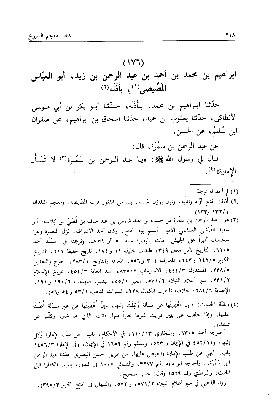 حَدَّثَنَا إِبْرَاهِيمُ بْنُ مُحَمَّدٍ بِأَذَنَةَ، حَدَّثَنَا أَبُو بَكْرِ بْنُ أَبِي مُوسَى الْأَنْطَاكِيُّ، حَدَّثَنَا يَعْقُوبُ بْنُ حُمَيْدٍ، حَدَّثَنَا إِسْحَاقُ بْنُ إِبْرَاهِيمَ، عَنْ صَفْوَانَ بْنِ سُلَيْمٍ، عَنِ الْحَسَنِ، عَنْ عَبْدِ الرَّحْمَنِ بْنِ سَمُرَةَ، قَالَ: قَالَ لِي رَسُولُ اللَّهِ صَلَّى اللهُ عَلَيْهِ وَسَلَّمَ: «يَا عَبْدَ الرَّحْمَنِ بْنَ سَمُرَةَ، §لَا تَسْأَلِ الْإِمَارَةَ»