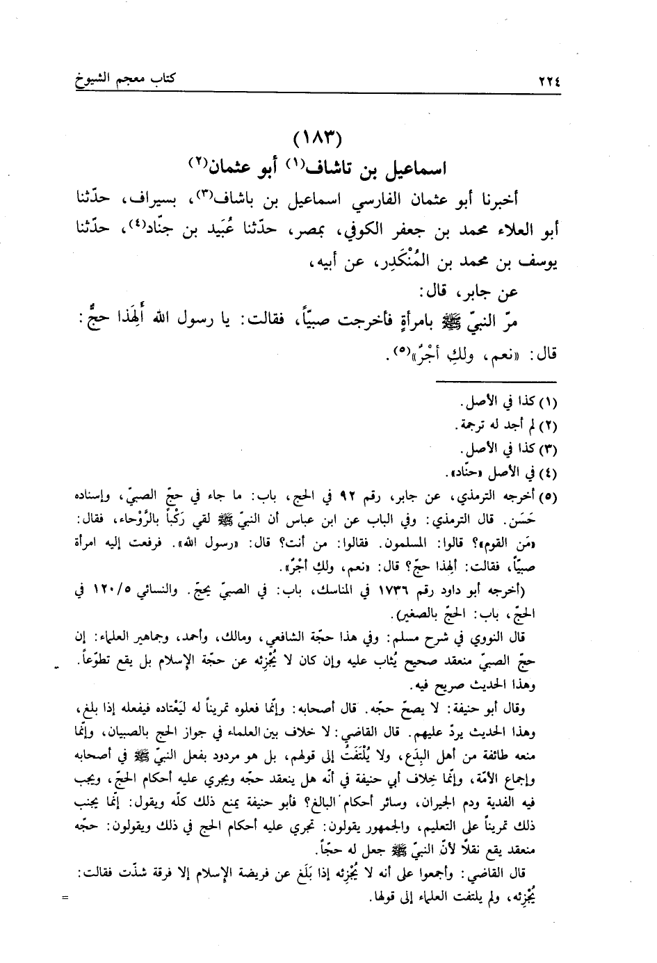 أَخْبَرَنَا أَبُو عُثْمَانَ الْفَارِسِيُّ إِسْمَاعِيلُ بْنُ بَاشَافَ بِسِيرَافَ، حَدَّثَنَا أَبُو الْعَلَاءِ مُحَمَّدُ بْنُ جَعْفَرٍ الْكُوفِيُّ بِمِصْرَ، حَدَّثَنَا عُبَيْدُ بْنُ جَنَّادٍ، حَدَّثَنَا يُوسُفُ بْنُ مُحَمَّدِ بْنِ الْمُنْكَدِرِ، عَنْ أَبِيهِ، عَنْ جَابِرٍ، قَالَ: مَرَّ النَّبِيُّ صَلَّى اللهُ عَلَيْهِ وَسَلَّمَ بِامْرَأَةٍ، فَأَخْرَجَتْ صَبِيًّا، فَقَالَتْ: يَا رَسُولَ اللَّهِ §أَلِهَذَا حَجٌّ؟ قَالَ: «نَعَمْ وَلَكِ أَجْرٌ»