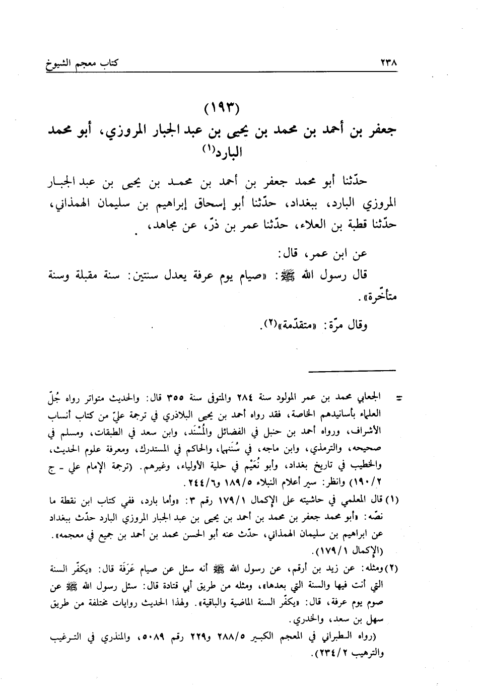 حَدَّثَنَا أَبُو مُحَمَّدٍ جَعْفَرُ بْنُ أَحْمَدَ بْنِ مُحَمَّدِ بْنِ يَحْيَى بْنِ عَبْدِ الْجَبَّارِ الْمَرْوَزِيُّ الْبَارِدُ بِبَغْدَادَ، حَدَّثَنَا أَبُو إِسْحَاقَ إِبْرَاهِيمُ بْنُ سُلَيْمَانَ الْهَمَذَانِيُّ، حَدَّثَنَا قُطْبَةُ بْنُ الْعَلَاءِ، حَدَّثَنَا عُمَرُ بْنُ ذَرٍّ، عَنْ مُجَاهِدٍ، عَنِ ابْنِ عُمَرَ، قَالَ: قَالَ رَسُولُ اللَّهِ صَلَّى اللهُ عَلَيْهِ وَسَلَّمَ: «§صِيَامُ يَوْمِ عَرَفَةَ يَعْدِلُ سَنَتَيْنِ، سَنَةً مُقْبِلَةً وَسَنَةً مُتَأَخِّرَةً» وَقَالَ مَرَّةً: «مُتَقَدِّمَةً»