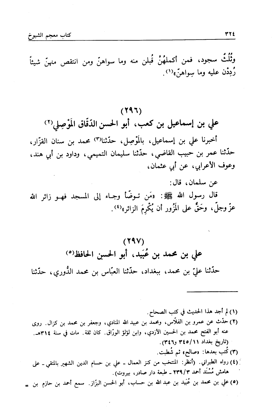 أَخْبَرَنَا عَلِيُّ بْنُ إِسْمَاعِيلَ بِالْمَوْصِلِ، حَدَّثَنَا مُحَمَّدُ بْنُ سِنَانٍ الْقَزَّازُ، حَدَّثَنَا عُمَرُ بْنُ حَبِيبٍ الْقَاضِي، حَدَّثَنَا سُلَيْمَانُ التَّمِيمِيُّ، وَدَاوُدُ بْنُ أَبِي هِنْدٍ، وَعَوْفٌ الْأَعْرَابِيُّ، عَنْ أَبِي عُثْمَانَ، عَنْ سَلْمَانَ، قَالَ: قَالَ رَسُولُ اللَّهِ صَلَّى اللهُ عَلَيْهِ وَسَلَّمَ: §«مَنْ تَوَضَّأَ وَجَاءَ إِلَى الْمَسْجِدِ فَهُوَ زَائِرُ اللَّهِ عَزَّ وَجَلَّ، وَحَقٌّ عَلَى الْمَزُورِ أَنْ يُكْرِمَ الزَّائِرَ»