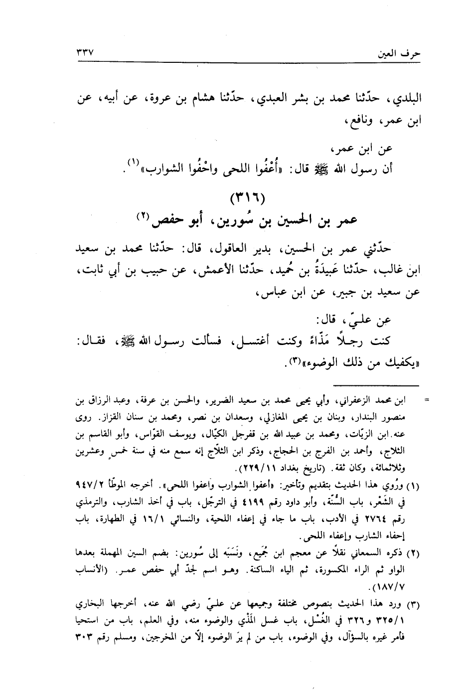 حَدَّثَنِي عُمَرُ بْنُ الْحُسَيْنِ بِدَيْرِ الْعَاقُولِ، قَالَ: حَدَّثَنَا مُحَمَّدُ بْنُ سَعِيدِ بْنِ غَالِبٍ، حَدَّثَنَا عَبِيدَةُ بْنُ حُمَيْدٍ، حَدَّثَنَا الْأَعْمَشُ، عَنْ حَبِيبِ بْنِ أَبِي ثَابِتٍ، عَنْ سَعِيدِ بْنِ جُبَيْرٍ، عَنِ ابْنِ عَبَّاسٍ، عَنْ عَلِيٍّ، قَالَ: كُنْتُ رَجُلًا مَذَّاءً، وَكُنْتُ أَغْتَسِلُ، فَسَأَلْتُ رَسُولَ اللَّهِ صَلَّى اللهُ عَلَيْهِ وَسَلَّمَ فَقَالَ: §«يَكْفِيكَ مِنْ ذَلِكَ الْوُضُوءُ»