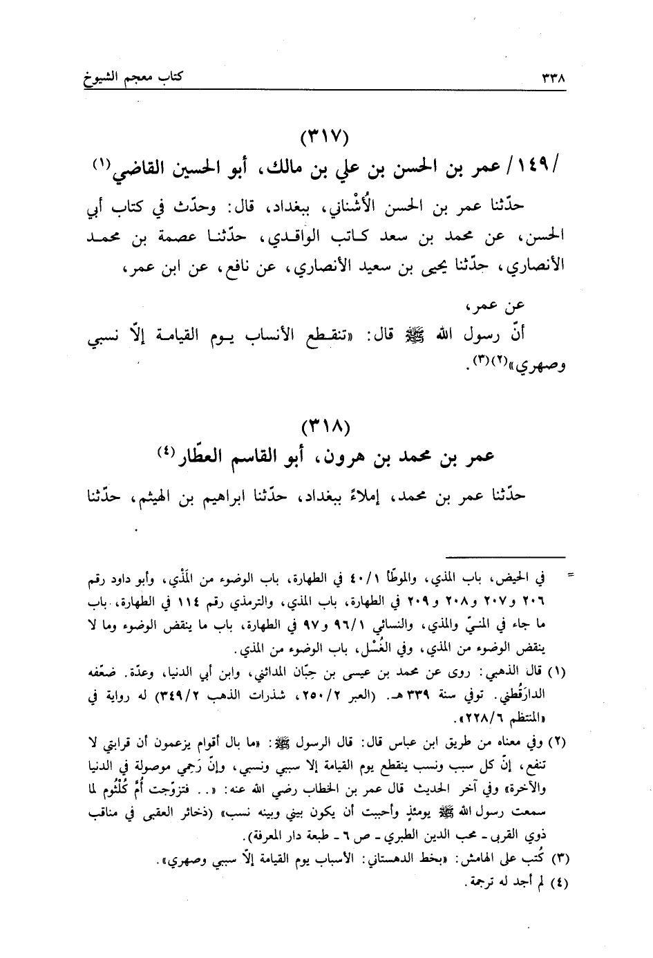 حَدَّثَنَا عُمَرُ بْنُ الْحَسَنِ الْأُشْنَانِيُّ بِبَغْدَادَ، قَالَ وَحَدَّثَ فِي، كِتَابِ أَبِي الْحَسَنِ: عَنْ مُحَمَّدِ بْنِ سَعْدٍ كَاتِبِ الْوَاقِدِيِّ، حَدَّثَنَا عِصْمَةُ بْنُ مُحَمَّدٍ الْأَنْصَارِيُّ، حَدَّثَنَا يَحْيَى بْنُ سَعِيدٍ الْأَنْصَارِيُّ، عَنْ نَافِعٍ، عَنِ ابْنِ عُمَرَ، عَنْ عُمَرَ، أَنَّ رَسُولَ اللَّهِ صَلَّى اللهُ عَلَيْهِ وَسَلَّمَ قَالَ: §«تَنْقَطِعُ الْأَنْسَابُ يَوْمَ الْقِيَامَةِ إِلَّا نَسَبِي وَصِهْرِي»