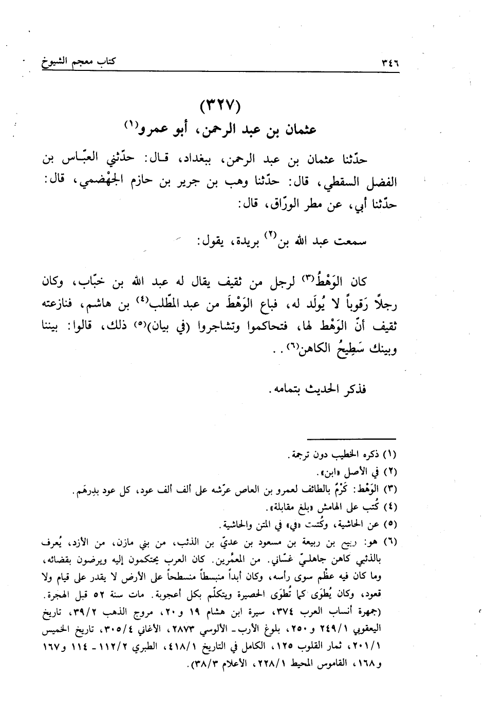 §عُثْمَانُ بْنُ عَبْدِ الرَّحْمَنِ أَبُو عَمْرٍو حَدَّثَنَا عُثْمَانُ بْنُ عَبْدِ الرَّحْمَنِ، بِبَغْدَادَ، قَالَ: حَدَّثَنِيَ الْعَبَّاسُ بْنُ الْفَضْلِ السَّقَطِيُّ، قَالَ: حَدَّثَنَا وَهْبُ بْنُ جَرِيرِ بْنِ حَازِمٍ الْجَهْضَمِيُّ، قَالَ: حَدَّثَنَا أَبِي، عَنْ مَطَرٍ الْوَرَّاقِ، قَالَ: سَمِعْتُ عَبْدَ اللَّهِ بْنَ بُرَيْدَةَ، يَقُولُ: كَانَ الْوَهْطُ لِرَجُلٍ مِنْ ثَقِيفٍ يُقَالُ لَهُ: عَبْدُ اللَّهِ بْنُ خَبَّابٍ، وَكَانَ رَجُلًا رَقُوبًا لَا يُولَدُ لَهُ، فَبَاعَ الْوَهْطَ مِنْ عَبْدِ الْمُطَّلِبِ بْنِ هَاشِمٍ، فَنَازَعَتْهُ ثَقِيفٌ أَنَّ الْوَهْطَ لَهَا فَتَحَاكَمُوا وَتَشَاجَرُوا فِي بَيَانِ ذَلِكَ، قَالُوا: بَيْنَنَا وَبَيْنَكَ سَطِيحٌ الْكَاهِنُ، فَذَكَرَ الْحَدِيثَ بِتَمَامِهِ