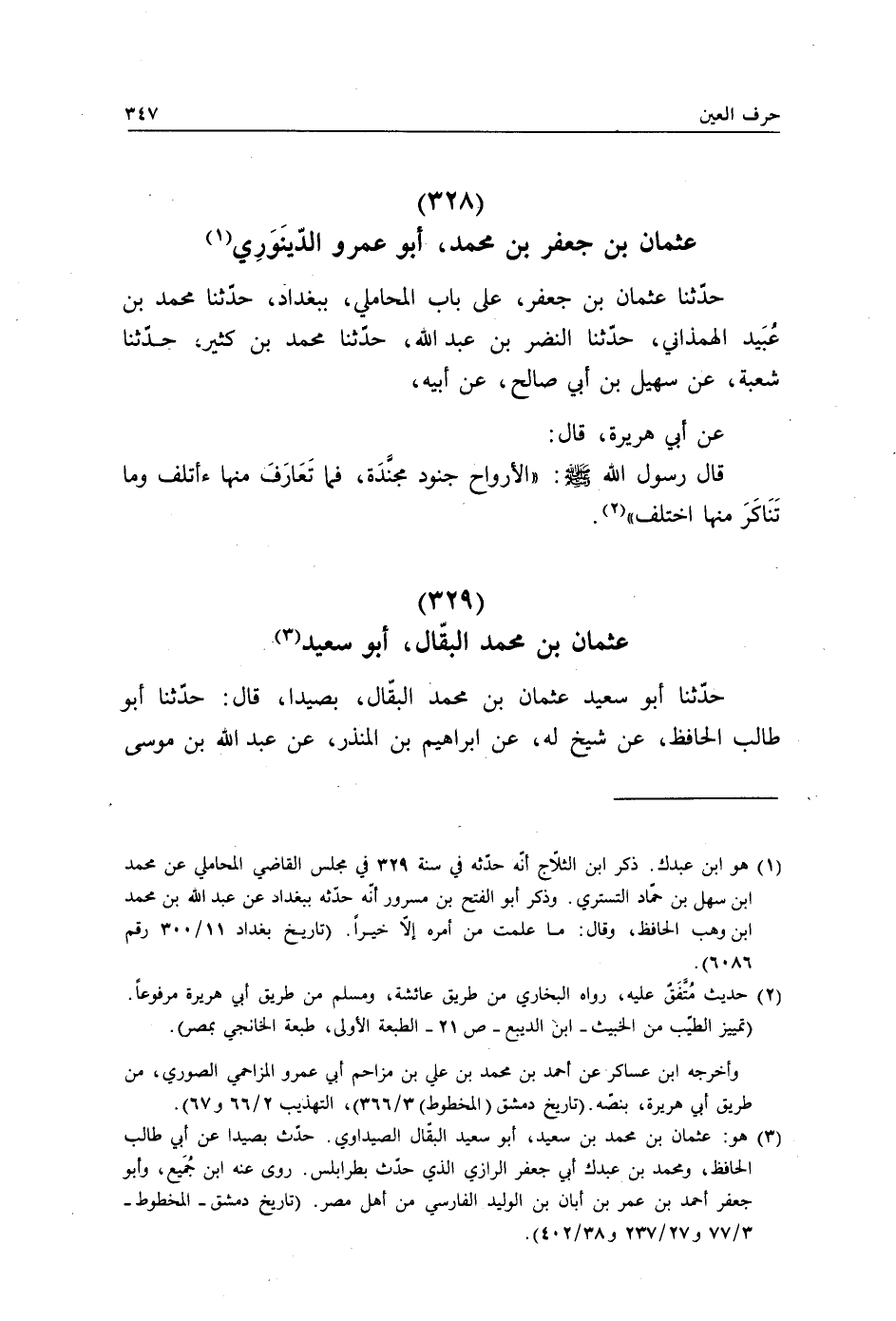 حَدَّثَنَا عُثْمَانُ بْنُ جَعْفَرٍ، عَلَى بَابِ الْمَحَامِلِيِّ بِبَغْدَادَ، حَدَّثَنَا مُحَمَّدُ بْنُ عُبَيْدٍ الْهَمَذَانِيُّ، حَدَّثَنَا النَّضْرُ بْنُ عَبْدِ اللَّهِ، حَدَّثَنَا مُحَمَّدُ بْنُ كَثِيرٍ، حَدَّثَنَا شُعْبَةُ، عَنْ سُهَيْلِ بْنِ أَبِي صَالِحٍ، عَنْ أَبِيهِ، عَنْ أَبِي هُرَيْرَةَ، قَالَ: قَالَ رَسُولُ اللَّهِ صَلَّى اللهُ عَلَيْهِ وَسَلَّمَ: «§الْأَرْوَاحُ جُنُودٌ مُجَنَّدَةٌ، فَمَا تَعَارَفَ مِنْهَا ائْتَلَفَ وَمَا تَنَاكَرَ مِنْهَا اخْتَلَفَ»