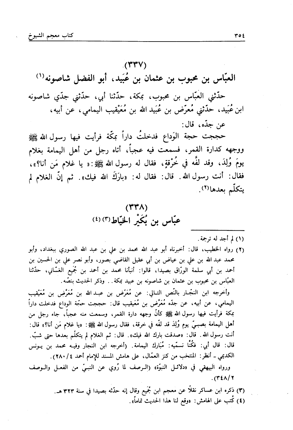 حَدَّثَنِي الْعَبَّاسُ بْنُ مَحْبُوبٍ بِمَكَّةَ، حَدَّثَنَا أَبِي، حَدَّثَنِي جَدِّي، شَاصُونَةُ بْنُ عُبَيْدٍ، حَدَّثَنِي مُعَرِّضُ بْنُ عُبَيْدِ اللَّهِ بْنِ مُعَيْقِيبٍ الْيَمَامِيُّ، عَنْ أَبِيهِ، عَنْ جَدِّهِ، قَالَ: حَجَجْتُ حَجَّةَ الْوَدَاعِ، فَدَخَلْتُ دَارًا بِمَكَّةَ، " فَرَأَيْتُ فِيهَا رَسُولَ اللَّهِ صَلَّى اللهُ عَلَيْهِ وَسَلَّمَ وَوَجْهُهُ كَدَارَةِ الْقَمَرِ، فَسَمِعْتُ فِيهِ عَجَبًا، أَتَاهُ رَجُلٌ مِنْ أَهْلِ الْيَمَامَةِ بِغُلَامٍ يَوْمَ وُلِدَ، وَقَدْ لَفَّهُ فِي خِرْقَةٍ، فَقَالَ لَهُ رَسُولُ اللَّهِ صَلَّى اللهُ عَلَيْهِ وَسَلَّمَ: «§يَا غُلَامُ مَنْ أَنَا؟» فَقَالَ: أَنْتَ رَسُولُ اللَّهِ، قَالَ: فَقَالَ لَهُ: «بَارَكَ اللَّهُ فِيكَ» ثُمَّ إِنَّ الْغُلَامَ لَمْ يَتَكَلَّمْ بَعْدَهَا