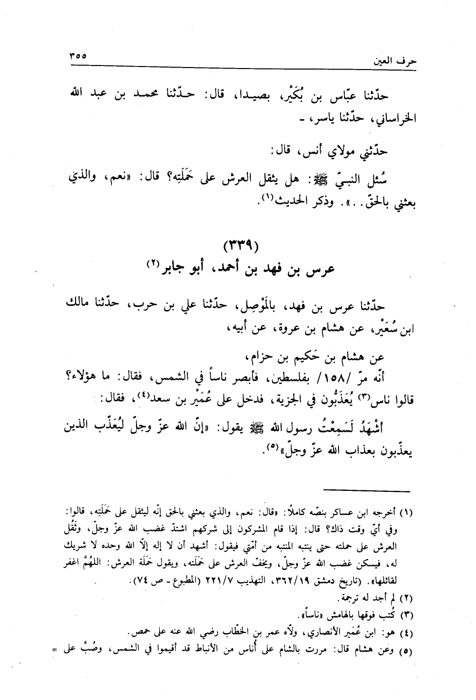 حَدَّثَنَا عُرْسُ بْنُ فَهْدٍ بِالْمَوْصِلِ، حَدَّثَنَا عَلِيُّ بْنُ حَرْبٍ، حَدَّثَنَا مَالِكُ بْنُ سُعَيْرٍ، عَنْ هِشَامِ بْنِ عُرْوَةَ، عَنْ أَبِيهِ، عَنْ هِشَامِ بْنِ حَكِيمِ بْنِ حِزَامٍ، أَنَّهُ مَرَّ بِفَلَسْطِينَ، فَأَبْصَرَ نَاسًا فِي الشَّمْسِ، فَقَالَ: مَا هَؤُلَاءِ؟ قَالُوا: نَاسٌ يُعَذَّبُونَ فِي الْجِزْيَةِ، فَدَخَلَ عَلَى عُمَيْرِ بْنِ سَعْدٍ، فَقَالَ: أَشْهَدُ لَسَمِعْتُ رَسُولَ اللَّهِ صَلَّى اللهُ عَلَيْهِ وَسَلَّمَ يَقُولُ: «إِنَّ §اللَّهَ عَزَّ وَجَلَّ لَيُعَذِّبُ الَّذِينَ يُعَذِّبُونَ بِعَذَابِ اللَّهِ عَزَّ وَجَلَّ»