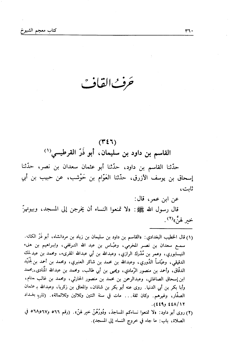 حَدَّثَنَا الْقَاسِمُ بْنُ دَاوُدَ، حَدَّثَنَا أَبُو عُثْمَانَ سَعْدَانُ بْنُ نَصْرٍ، حَدَّثَنَا إِسْحَاقُ بْنُ يُوسُفَ الْأَزْرَقُ، حَدَّثَنَا الْعَوَّامُ بْنُ حَوْشَبٍ، عَنْ حَبِيبِ بْنِ أَبِي ثَابِتٍ، عَنِ ابْنِ عُمَرَ، قَالَ: قَالَ رَسُولُ اللَّهِ صَلَّى اللهُ عَلَيْهِ وَسَلَّمَ: §«لَا تَمْنَعُوا النِّسَاءَ أَنْ يَخْرُجْنَ إِلَى الْمَسْجِدِ وَبُيُوتُهُنَّ خَيْرٌ لَهُنَّ»