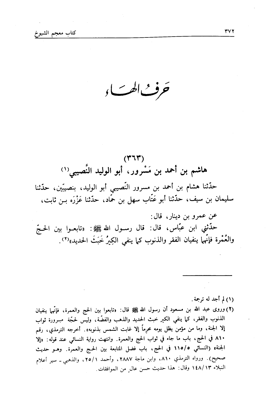 حَدَّثَنَا هِشَامُ بْنُ أَحْمَدَ بْنِ مَسْرُورٍ النَّصِيبِيُّ أَبُو الْوَلِيدِ، بِنَصِيبِينَ، حَدَّثَنَا سُلَيْمَانُ بْنُ سَيْفٍ، حَدَّثَنَا أَبُو عَتَّابٍ سَهْلُ بْنُ حَمَّادٍ، حَدَّثَنَا عَزْرَةُ بْنُ ثَابِتٍ، عَنْ عَمْرِو بْنِ دِينَارٍ، قَالَ: حَدَّثَنِي ابْنُ عَبَّاسٍ، قَالَ: قَالَ رَسُولُ اللَّهِ صَلَّى اللهُ عَلَيْهِ وَسَلَّمَ: «§تَابِعُوا بَيْنَ الْحَجِّ وَالْعُمْرَةِ، فَإِنَّهُمَا يَنْفِيَانِ الْفَقْرَ وَالذُّنُوبَ، كَمَا يَنْفِي الْكِيرُ خَبَثَ الْحَدِيدِ»