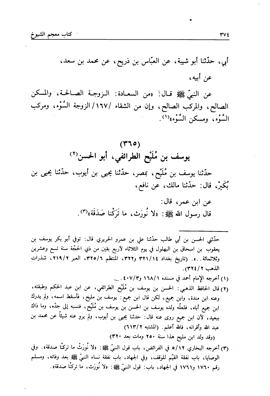 حَدَّثَنَا يُوسُفُ بْنُ مَلِيحٍ، بِمِصْرَ، حَدَّثَنَا يَحْيَى بْنُ أَيُّوبَ، حَدَّثَنَا يَحْيَى بْنُ بُكَيْرٍ، قَالَ: حَدَّثَنَا مَالِكٌ، عَنْ نَافِعٍ، عَنِ ابْنِ عُمَرَ، قَالَ: قَالَ رَسُولُ اللَّهِ صَلَّى اللهُ عَلَيْهِ وَسَلَّمَ: «§لَا نُورَثُ، مَا تَرَكْنَا صَدَقَةٌ»