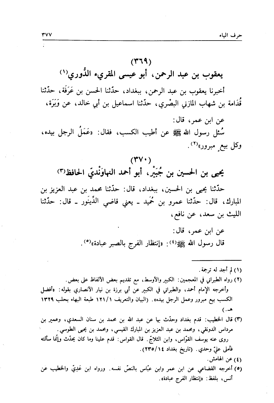 حَدَّثَنَا يَحْيَى بْنُ الْحُسَيْنِ، بِبَغْدَادَ، قَالَ: حَدَّثَنَا مُحَمَّدُ بْنُ عَبْدِ الْعَزِيزِ بْنِ الْمُبَارَكِ، قَالَ: حَدَّثَنَا عَمْرُو بْنُ حُمَيْدٍ، يَعْنِي قَاضِيَ الدَّيْنَوَرِ، قَالَ: حَدَّثَنَا اللَّيْثُ بْنُ سَعْدٍ، عَنْ نَافِعٍ، عَنِ ابْنِ عُمَرَ، قَالَ: قَالَ رَسُولُ اللَّهِ صَلَّى اللهُ عَلَيْهِ وَسَلَّمَ: §«انْتِظَارُ الْفَرَجِ بِالصَّبِرِ عُبَادَةٌ»