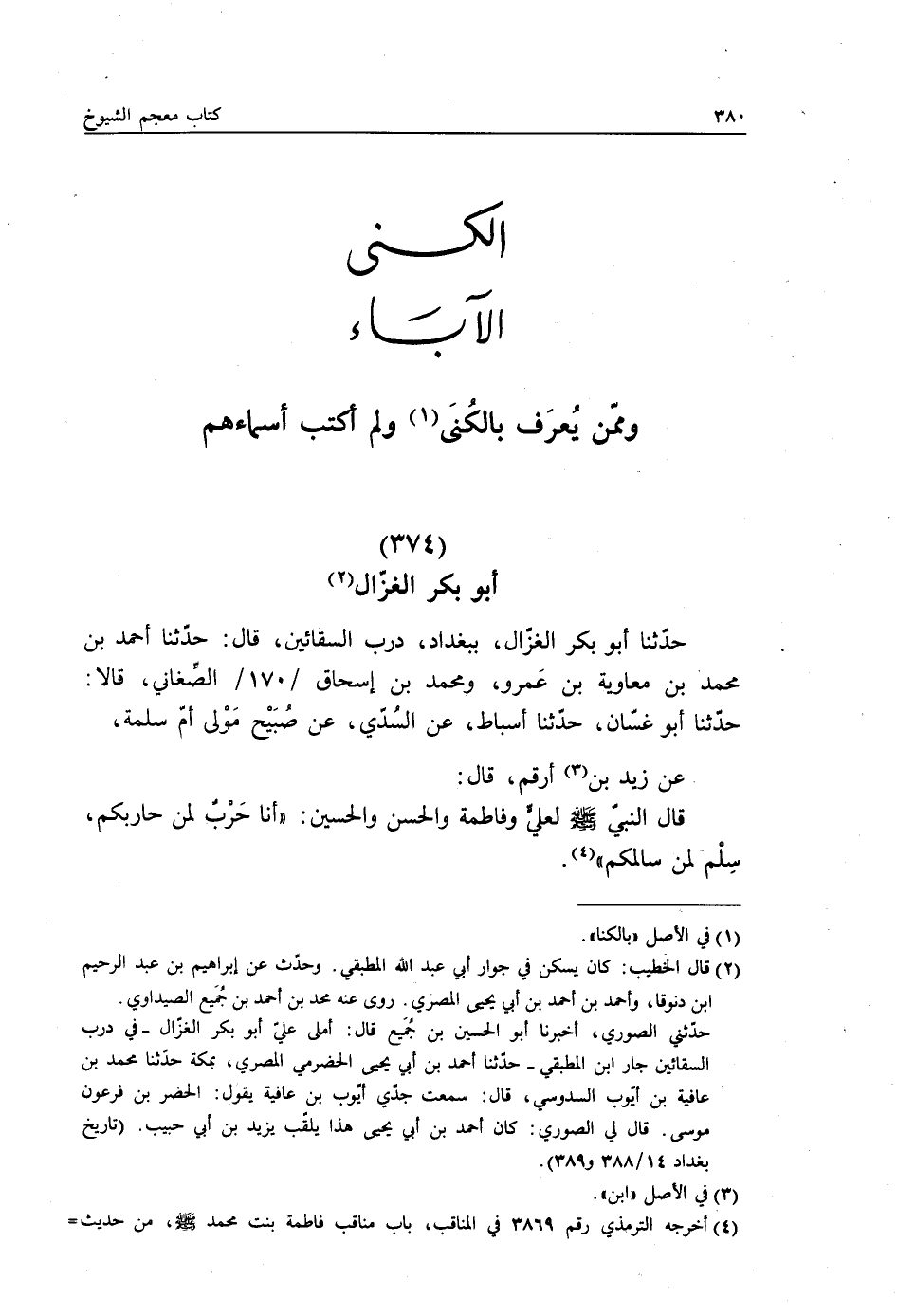 حَدَّثَنَا أَبُو بَكْرٍ الْغَزَّالُ، بِبَغْدَادَ دَرْبِ السَّقَّائِينَ، قَالَ: حَدَّثَنَا أَحْمَدُ بْنُ مُحَمَّدِ بْنِ مُعَاوِيَةَ بْنِ عَمْرٍو، وَمُحَمَّدُ بْنُ إِسْحَاقَ الصَّغَانِيُّ، قَالَا: حَدَّثَنَا أَبُو غَسَّانَ، حَدَّثَنَا أَسْبَاطُ، عَنِ السُّدِّيِّ، عَنْ صُبَيْحٍ، مَوْلَى أُمِّ سَلَمَةَ عَنْ زَيْدِ بْنِ أَرْقَمَ، قَالَ: قَالَ النَّبِيُّ صَلَّى اللهُ عَلَيْهِ وَسَلَّمَ لِعَلِيٍّ وَفَاطِمَةَ وَالْحَسَنِ وَالْحُسَيْنِ: «§أَنَا حَرْبٌ لِمَنْ حَارَبَكُمْ، سِلْمٌ لِمَنْ سَالَمَكُمْ»