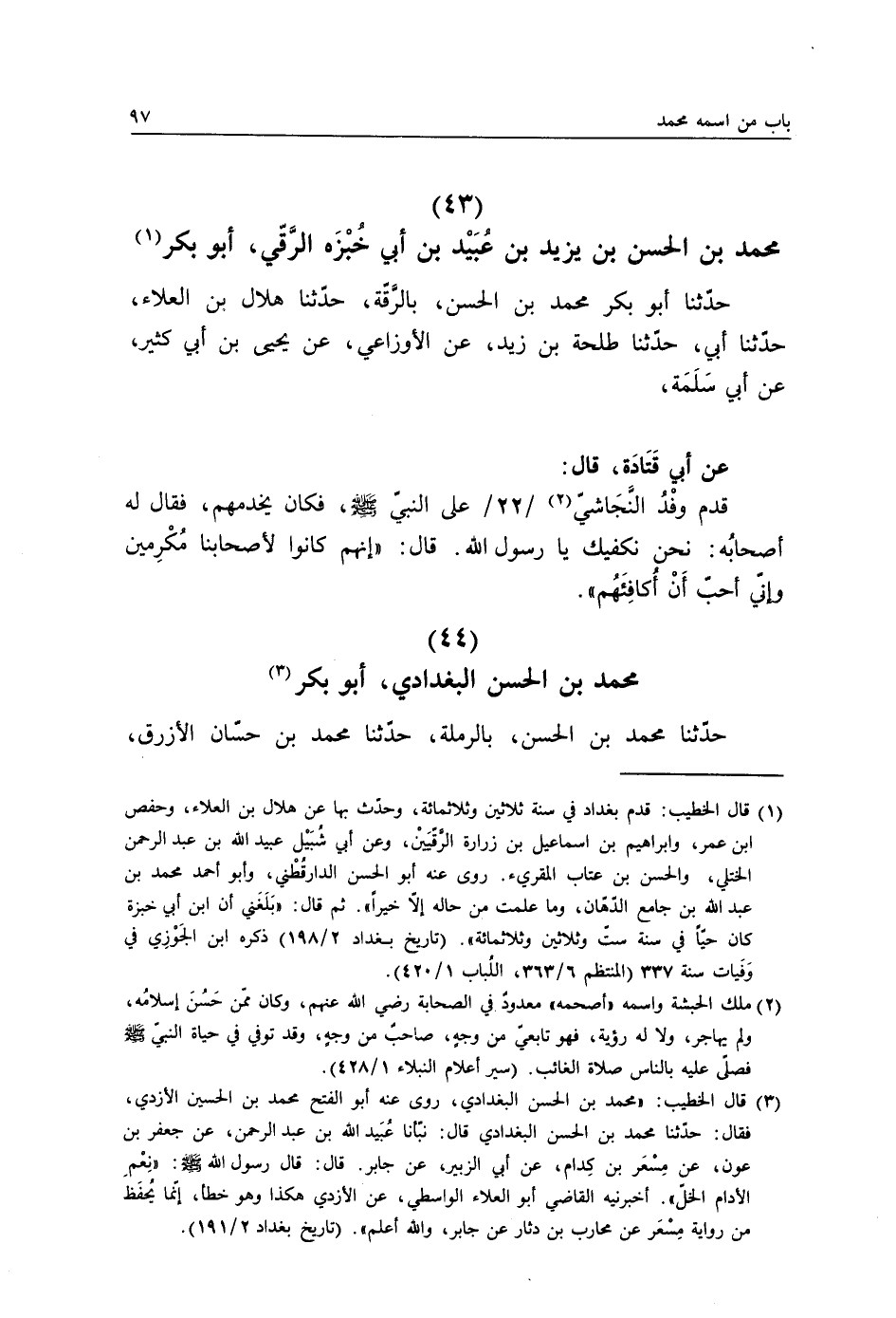 حَدَّثَنَا أَبُو بَكْرٍ مُحَمَّدُ بْنُ الْحَسَنِ بِالرَّقَّةِ، حَدَّثَنَا هِلَالُ بْنُ الْعَلَاءِ، حَدَّثَنَا أَبِي، حَدَّثَنَا طَلْحَةُ بْنُ زَيْدٍ، عَنِ الْأَوْزَاعِيِّ، عَنْ يَحْيَى بْنِ أَبِي كَثِيرٍ، عَنْ أَبِي سَلَمَةَ، عَنْ أَبِي قَتَادَةَ، قَالَ: قَدِمَ وَفْدُ النَّجَاشِيِّ عَلَى النَّبِيِّ صَلَّى اللهُ عَلَيْهِ وَسَلَّمَ فَكَانَ يَخْدُمُهُمْ فَقَالَ لَهُ أَصْحَابُهُ: نَحْنُ نَكْفِيكَ يَا رَسُولَ اللَّهِ، قَالَ: «إِنَّهُمْ §كَانُوا لِأَصْحَابِنَا مُكْرِمِينَ وَإِنِّي أُحِبُّ أَنْ أُكَافِئَهُمْ»