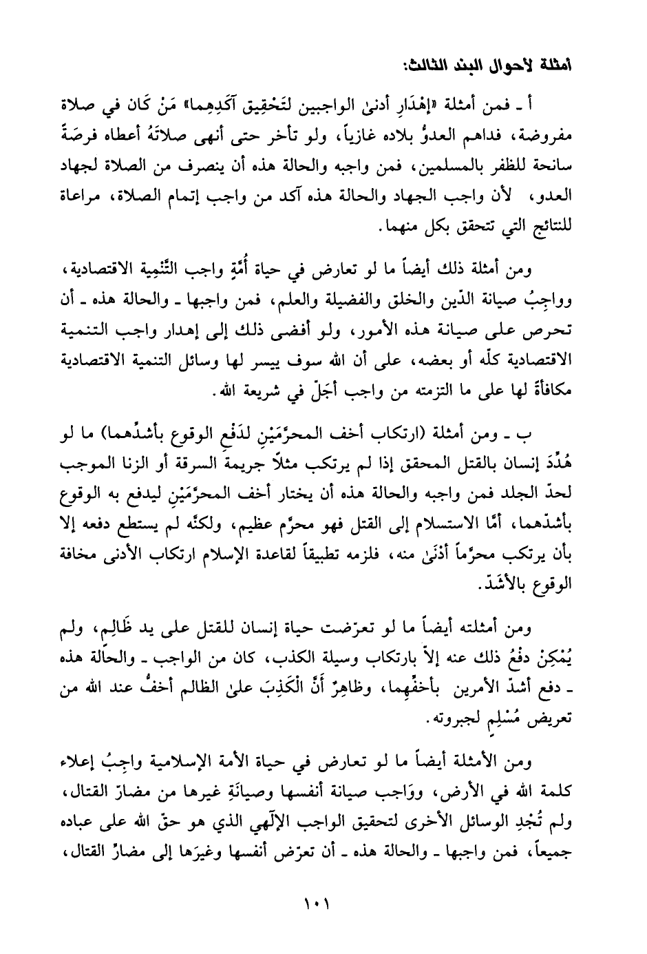 ومن الأمثلة أيضًا ما لو تعارض في حياة الأمة الإسلامية واجب إعلاء كلمة الله في الأرض، وواجب صيانة أنفسها وصيانة غيرها من مضار القتال، ولم تجد الوسائل الأخرى لتحقيق الواجب الإلهي الذي هو حق على عباده جميعًا، فمن واجبها -والحالة هذه- أن تعرض أنفسها وغيرها إلى مضار القتال،