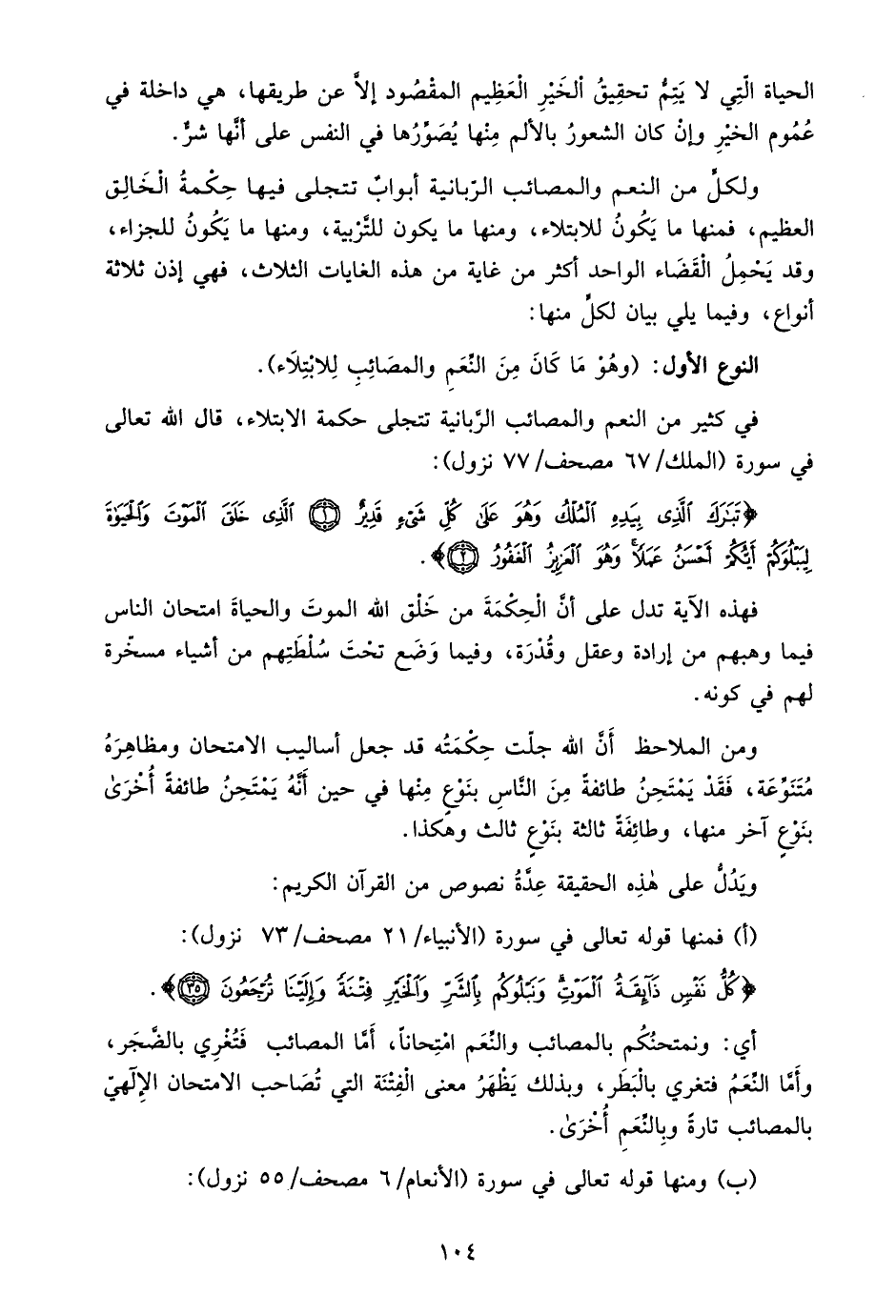 النوع الأول: "وهو ما كان من النعم والمصائب للابتلاء".