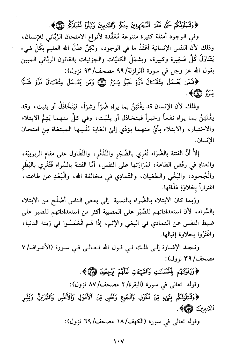 وربما كان الابتلاء بالضراء بالنسبة إلى بعض الناس أصلح من الابتلاء بالسراء؛ لأن استعداداتهم للصبر على المصيبة أكثر من استعداداتهم للصبر على ضبط النفس عن التمادي في البغي والإثم، إذا هم انغمسوا في زينة الدنيا، واغتروا بحلاوة إقبالها.