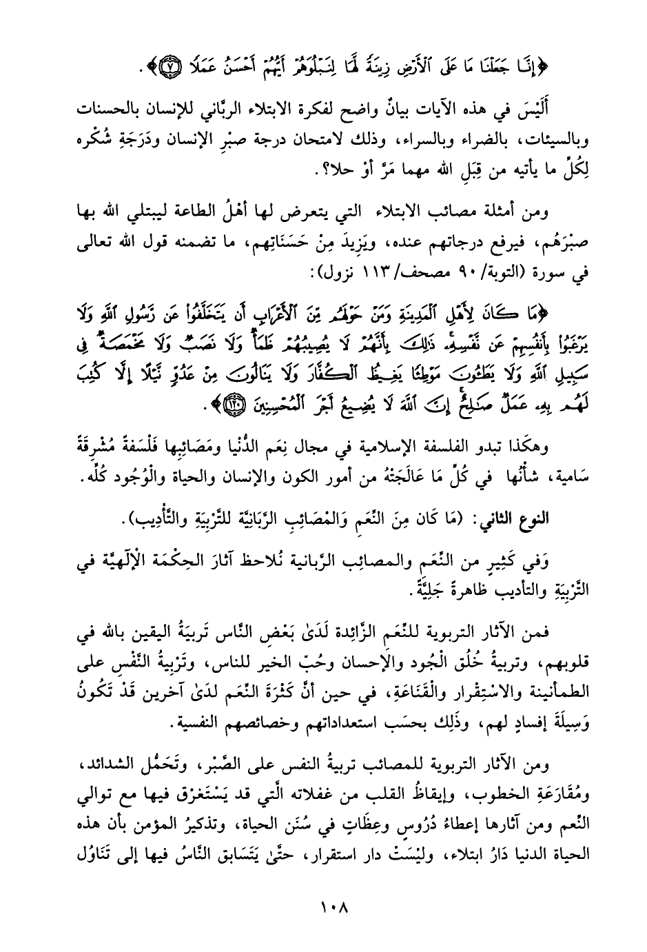 وهكذا تبدو الفلسفة الإسلامية في مجال نعم الدنيا ومصائبها فلسفة مشرفة سامية، شأنها في كل ما عالجته من أمور الكون والإنسان والحياة والوجود كله.