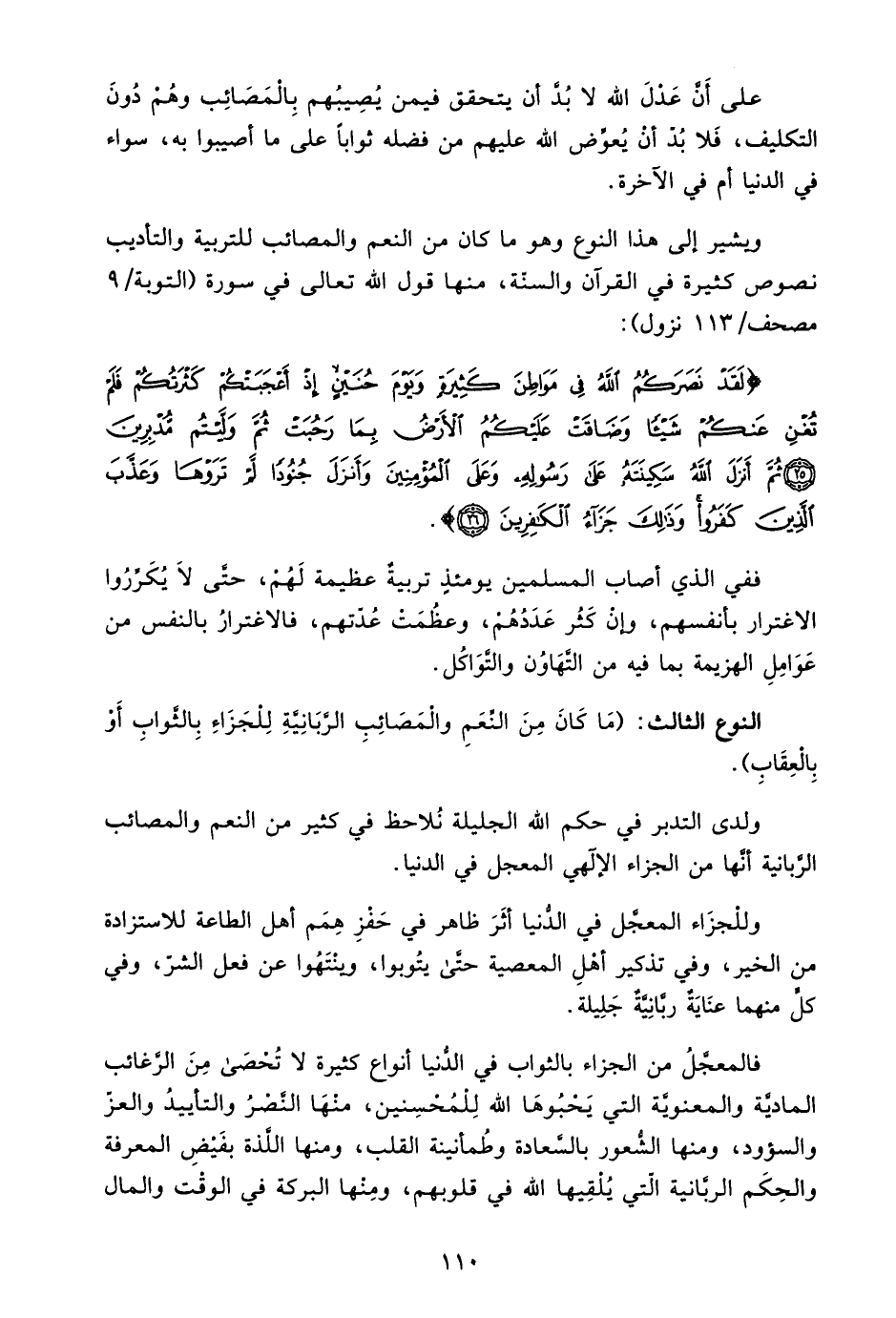 ويشير إلى هذا النوع وهو ما كان من النعم والمصائب للتربية والتأديب نصوص كثيرة في القرآن والسنة، ومنها قول الله تعالى في سورة "التوبة: 9 مصحف/ 113 نزول".