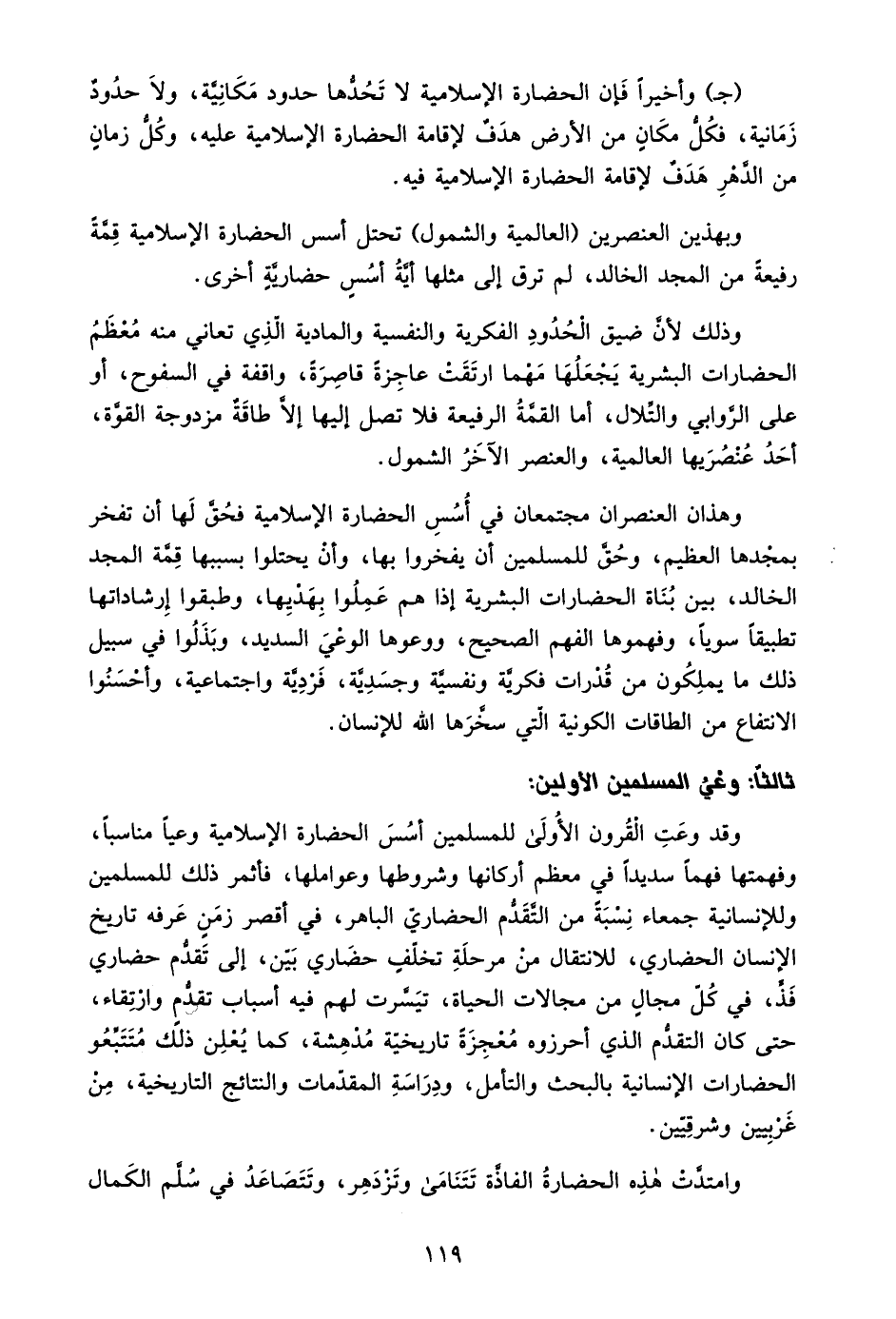 ج- وأخيرًا فإن الحضارة الإسلامية لا تحدها حدود مكانية، ولا حدود زمانية، فكل مكان من الأرض هدف لإقامة الحضارة الإسلامية عليه، وكل زمان من الدهر هدف لإقامة الحضارة الإسلامية فيه.