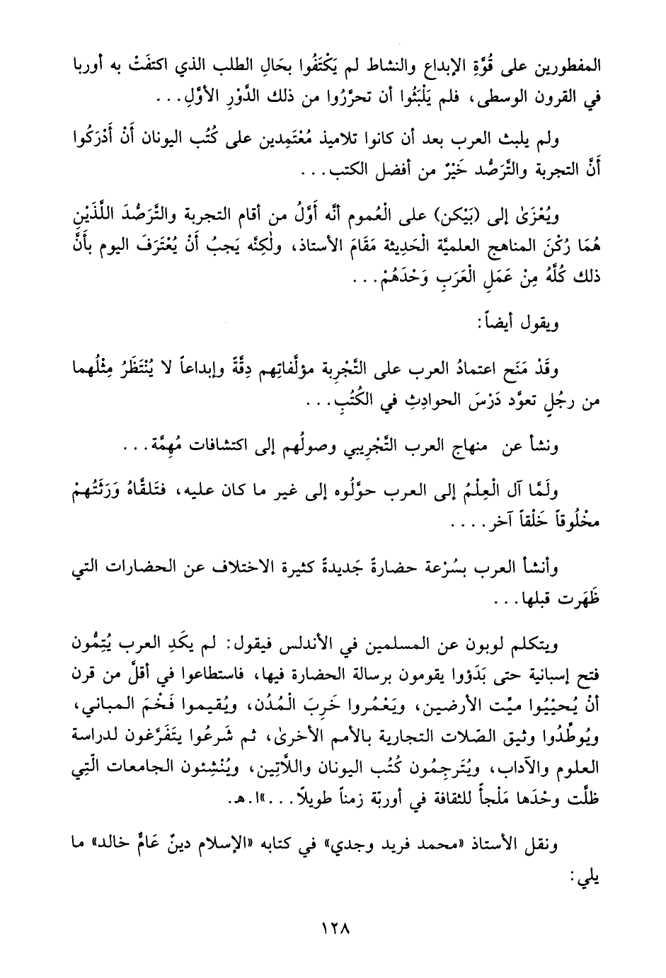 ونقل الأستاذ "محمد فريد وجدي" في كتابه "الإسلام دين عام خالد" ما يلي: