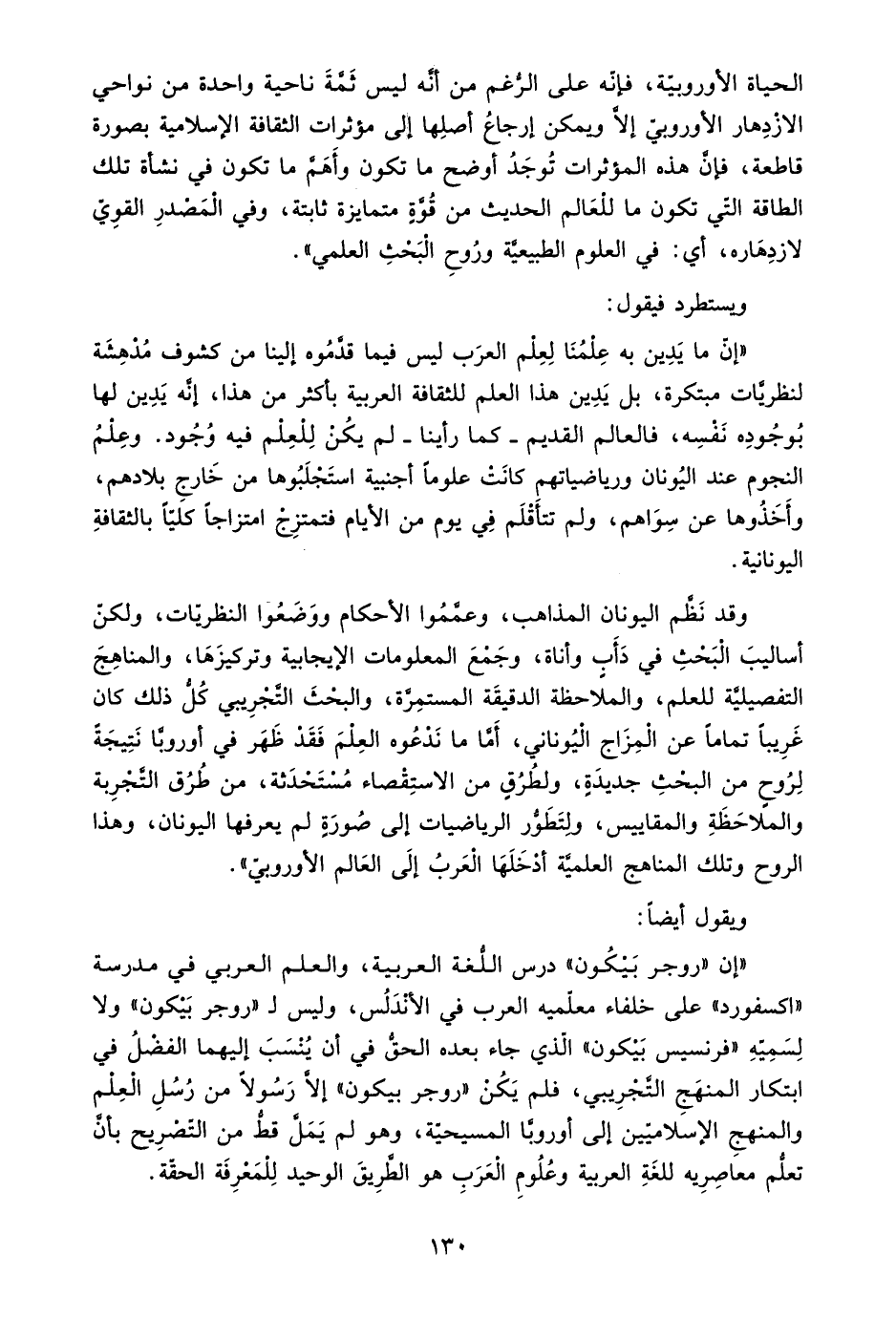 "إن ما يدين به علمنا لعلم العرب ليس فيما قدموه إلينا من كشوف مدهشة لنظريات مبتكرة، بل يدين هذا العلم للثقافة العربية بأكثر من هذا، إنه يدين لها بوجوده نفسه، فالعالم القديم -كما رأينا- لم يكن للعلم فيه وجود. وعلم النجوم عند اليونان ورياضياتهم كانت علومًا أجنبية استجلبوها من خارج بلادهم, وأخذوها عن سواهم، ولم تتأقلم في يوم من الأيام فتمتزج امتزاجًا كليًّا بالثقافة اليونانية.