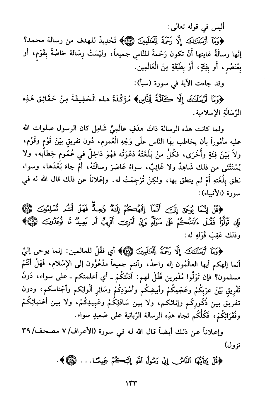 أليس في قوله تعالى: {وَمَا أَرْسَلْنَاكَ إِلَّا رَحْمَةً لِلْعَالَمِينَ} تحديد للهدف من رسالة محمد؟ إنها رسالة غايتها أن تكون رحمة للناس جميعًا، وليست رسالة خاصة بقوم، أو بعنصر، أو بفئة، أو بطبقة من العالمين.