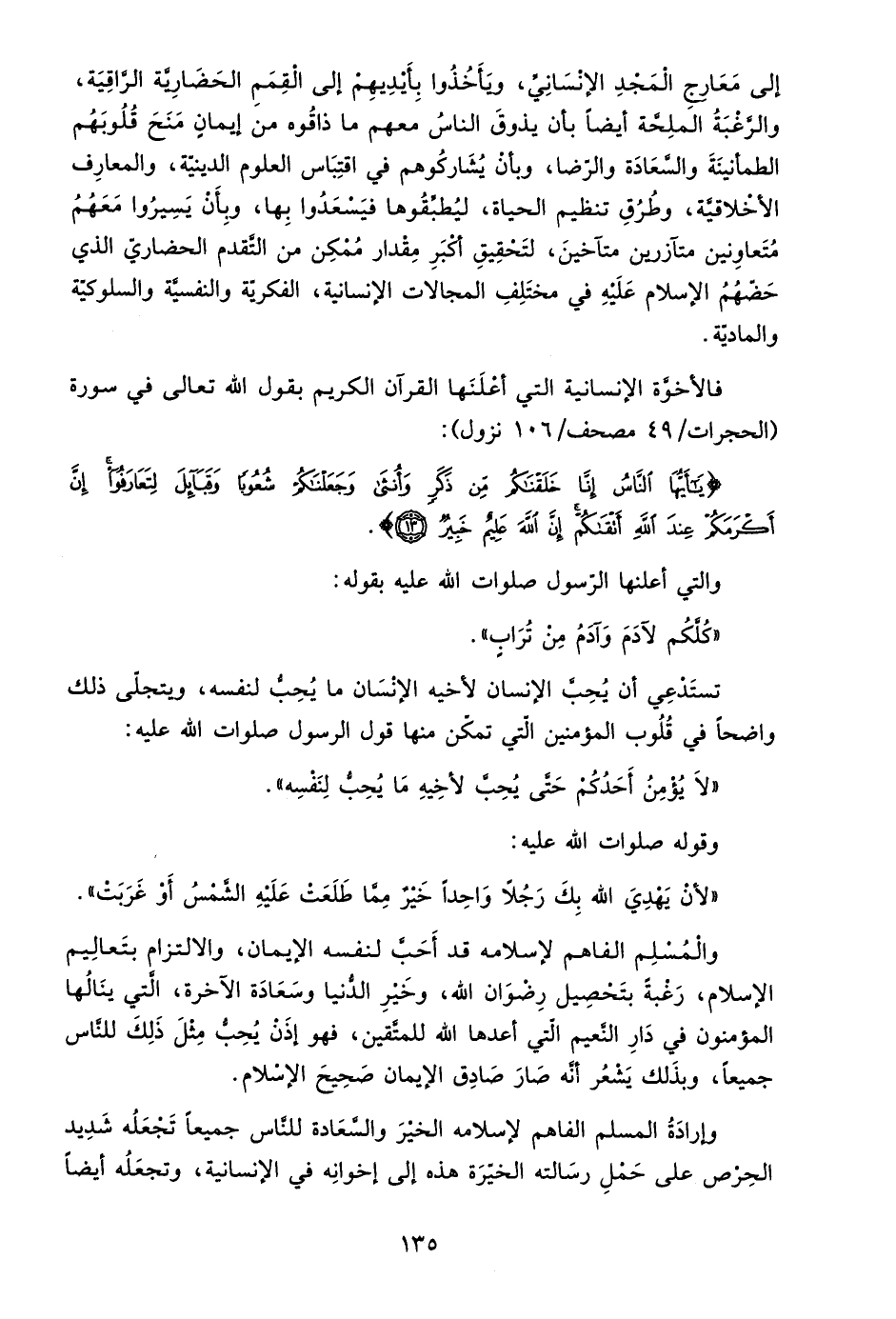 إلى معارج المجد الإنساني، ويأخذوا بأيديهم إلى القمم الحضارية الراقية، والرغبة الملحة أيضًا بأن يذوق الناس معهم ما ذاقوا من إيمان منح قلوبهم الطمأنينة والسعادة والرضا، وبأن يشاركوهم في اقتباس العلوم الدينية، والمعارف الأخلاقية، وطرق تنظيم الحياة، ليطبقوها فيسعدوا بها، وبأن تسيروا معهم متعاونين متآزرين متآخين، لتحقيق أكبر مقدار ممكن من التقدم الحضاري الذي حضهم الإسلام عليه في مختلف المجالات الإنسانية، الفكرية والنفسية والسلوكية والمادية.