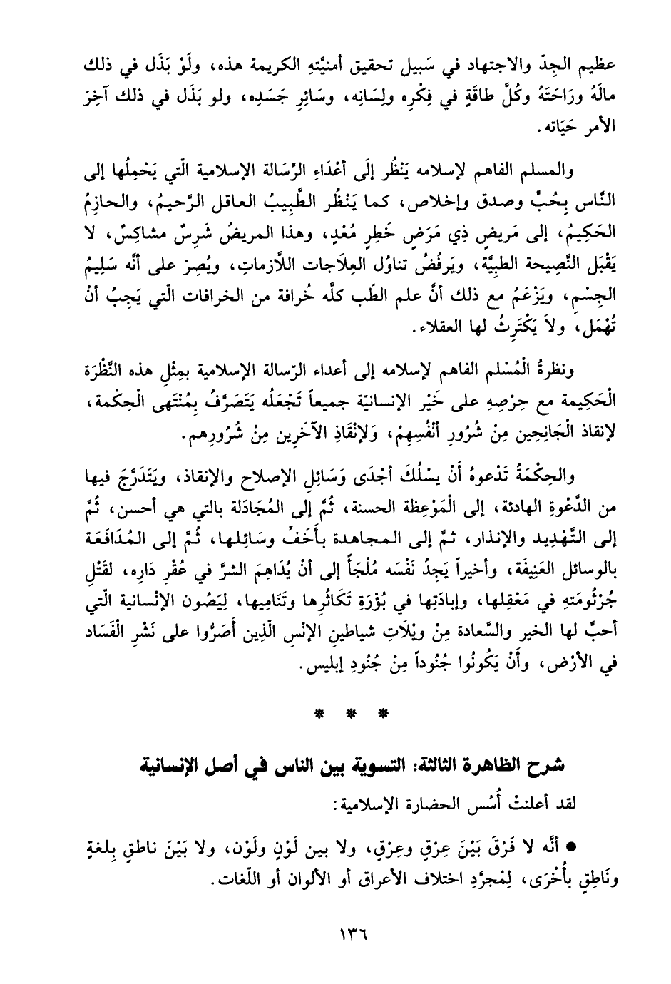 والمسلم الفاهم لإسلامه ينظر إلى أعداء الرسالة الإسلامية التي يحملها إلى الناس بحب وصدق وإخلاص، كما ينظر الطبيب العاقل الرحيم، والحازم الحكيم، إلى مريض ذي مرض خطر معد، وهذا المريض شرس مشاكس، لا يقبل النصيحة الطبية، ويرفض تناول العلاجات اللازمات، ويصر على أنه سليم الجسم، ويزعم مع ذلك أن علم الطب كله خرافة من الخرافات التي يجب أن تهمل، ولا يكترث لها العقلاء.
