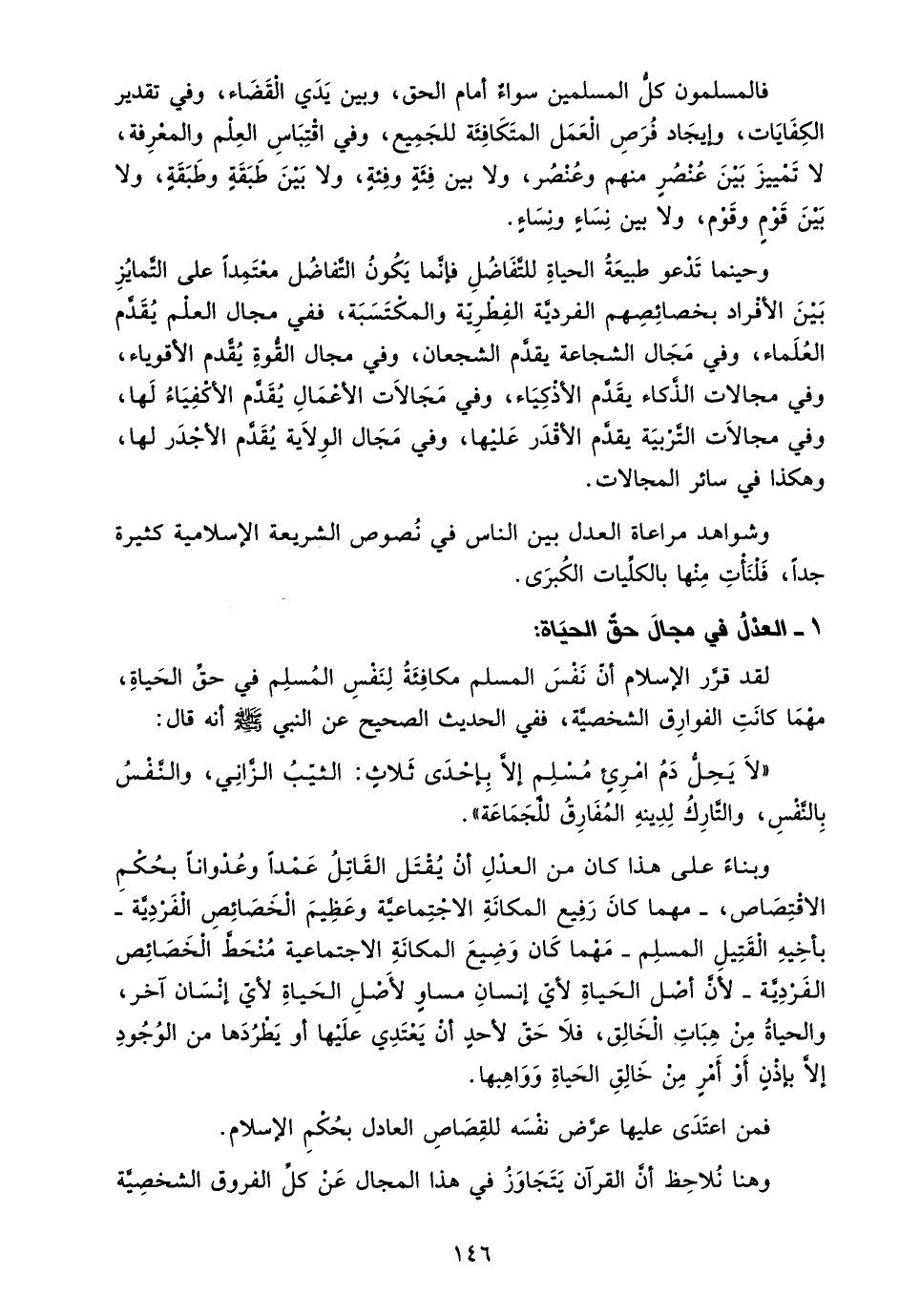 وبناء على هذا كان من العدل أن يقتل القائل عمدًا وعدوانًا بحكم الاقتصاص -مهما كان رفيع المكانة الاجتماعية وعظيم الخصائص الفردية- بأخيه القتيل المسلم مهما كان وضيع المكانة الاجتماعية منحط الخصائص الفردية لأن أصل الحياة لأي إنسان مساوٍ لأصل الحياة لأي إنسان آخر، والحياة من هبات الخالق، فلا حق لأحد أن يعتدي عليها أو يطردها من الوجود إلا بإذن أو أمر من خالق الحياة وواهبها.