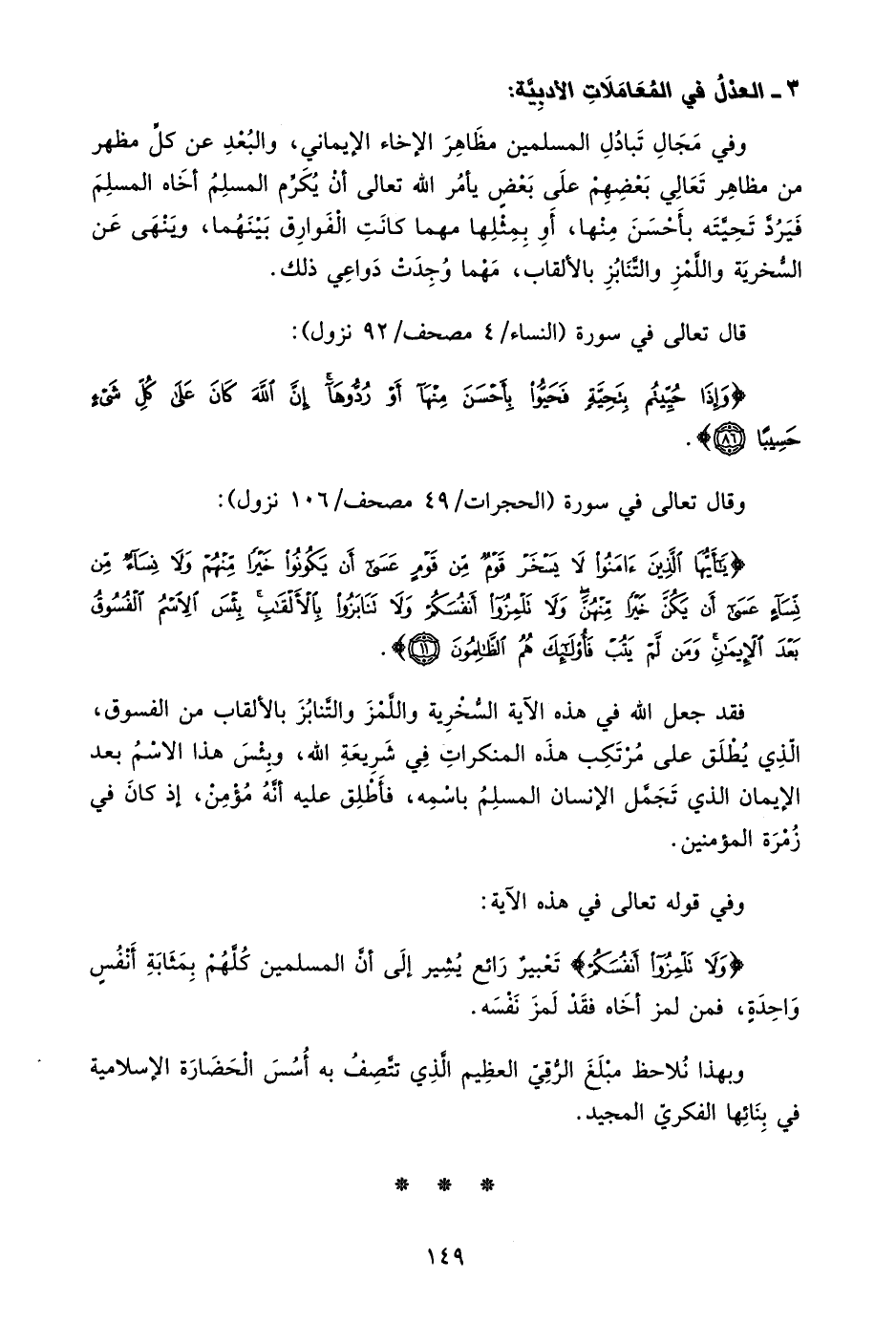 وفي مجال تبادل المسلمين مظاهر الإخاء الإيماني، والبعد عن كل مظهر من مظاهر تعالي بعضهم على بعض يأمر الله تعالى أن يكرم المسلم أخاه المسلم فيرد تحيته بأحسن منها، أو بمثلها مهما كانت الفوارق بينهما، وينهى عن السخرية واللمز والتنابز بالألقاب، مهما وجدت دواعي ذلك.