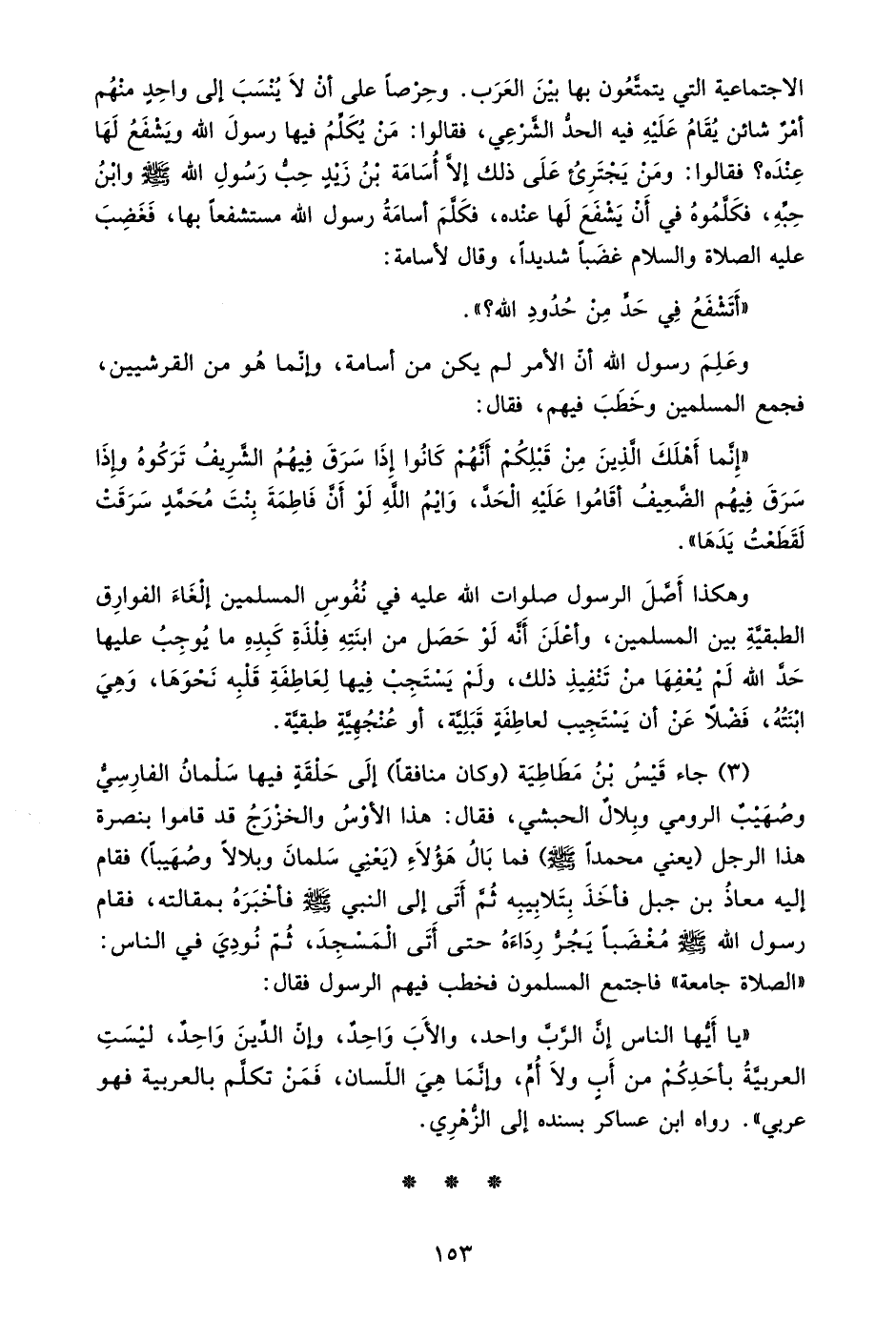 وهكذا أصل الرسول صلوات الله عليه في نفوس المسلمين إلغاء الفوارق الطبقية بين المسلمين، وأعلن أنه لو حصل من ابنته فلذة كبده، ما يوجب عليها حد الله لم يعفها من تنفيذ ذلك، ولم يستجب فيها لعاطفة قلبه نحوها، وهي ابنته، فضلًا عن أن يستجيب لعاطفة قبلية، أو عنجهية طبقية.