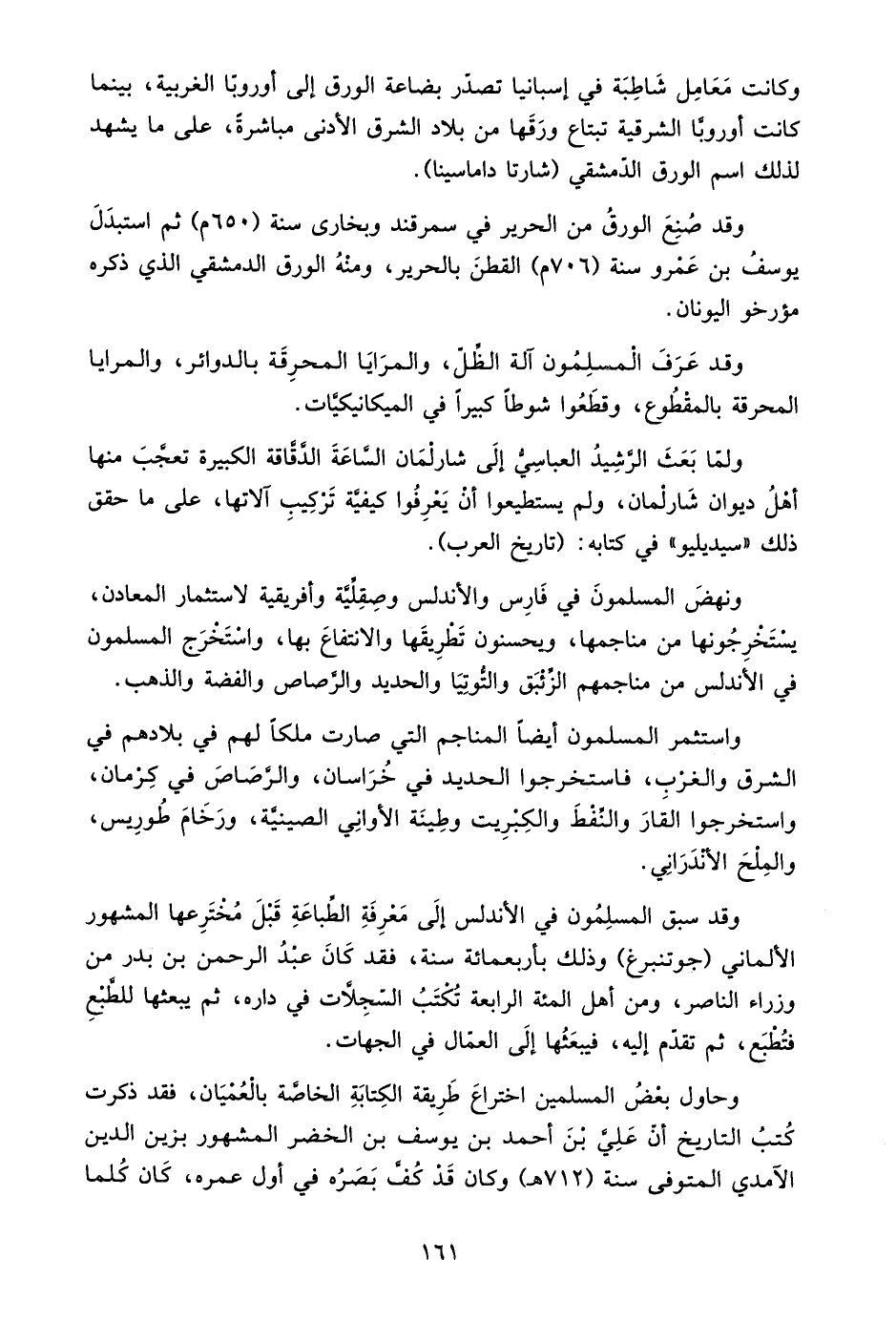 واستثمر المسلمون أيضًا المناجم التي صارت ملكًا لهم في بلادهم في الشرق والغرب، فاستخرجوا الحديد في خراسان، والرصاص في كرمان، واستخرجوا القار والنقط والكبريت وطينة الأواني الصينية، ورخام طوريس، والملح الأندراني.