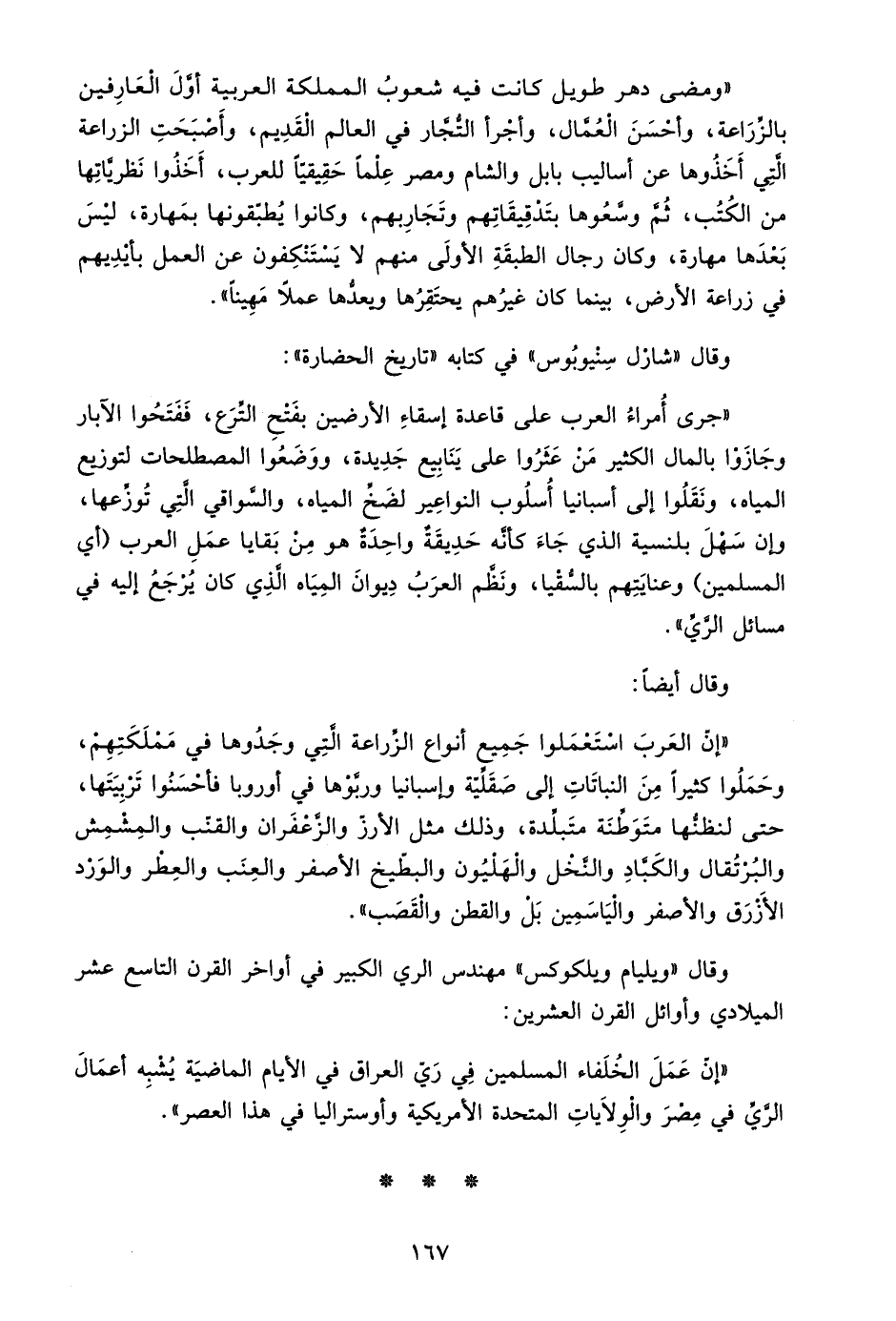 "ومضى دهر طويل كانت فيه شعوب المملكة العربية أول العارفين بالزراعة، وأحسن العمال، وأجرأ التجار في العالم القديم، وأصبحت الزراعة التي أخذوها عن أساليب بابل والشام ومصر علمًا حقيقيًّا للعرب، أخذوا نظرياتها من الكتب، ثم وسعوها بتدقيقاتهم وتجاربهم، وكانوا يطبقونها بمهارة، ليس بعدها مهارة، وكان رجال الطبقة الأولى منهم لا يستنكفون عن العمل بأيدهم في زراعة الأرض، بينما كان غيرهم يحتقرها ويعدها عملًا مهينًا".