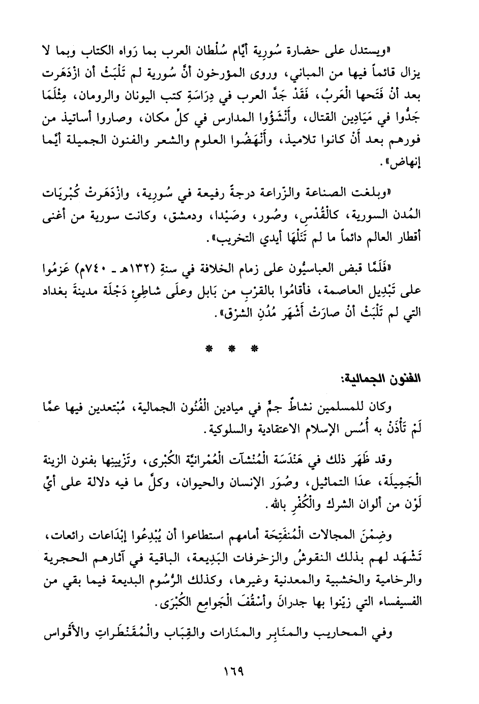 "ويستدل على حضارة سورية أيام سلطان العرب بما رواه الكتاب وبما لا يزال قائمًا فيها من المباني، وروى المؤرخون أن سورية لم تلبث أن ازدهرت بعد أن فتحها العرب، فقد جد العرب في دراسة كتب اليونان والرومان، مثلما جدوا في ميادين القتال، وأنشئوا المدارس في كل مكان، وصاروا أساتيذ من فورهم بعد أن كانوا تلاميذ، وأنهضوا العلوم والشعر والفنون الجميلة أيما إنهاض".
