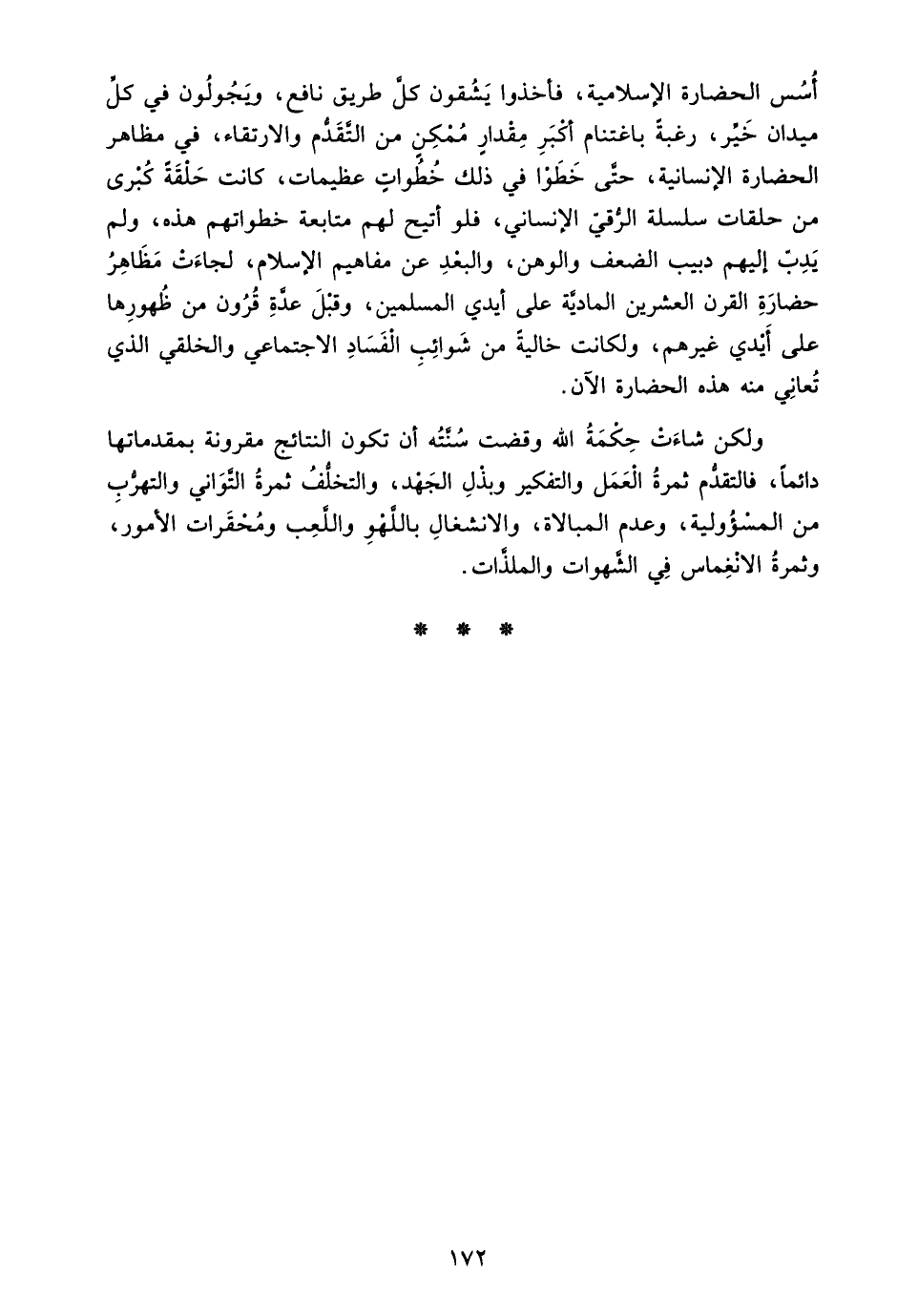 أسس الحضارة الإسلامية، فأخذوا يشقون كل طريق نافع، ويجولون في كل ميدان خير، رغبة باغتنام أكبر مقدار ممكن من التقدم والارتقاء، في مظاهر الحضارة الإنسانية، حتى خطوا في ذلك خطوات عظيمات، كانت خلقة كبرى من حلقات سلسلة الرقي الإنساني، فلو أتيح لهم متباعة خطواتهم هذه، ولم يدب إليهم دبيب الضعف والوهن، والبعد عن مفاهيم الإسلام، لجاءت مظاهر حضارة القرن العشرين المادية على أيدي المسلمين، وقبل عدة قرون من ظهورها على أيدي غيرهم، ولكانت خالية من شوائب الفساد الاجتماعي والخلقي الذي تعاني منه هذه الحضارة الآن.