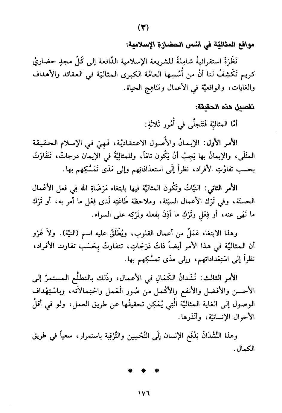 الأمر الثالث: نشدان الكمال في الأعمال، وذلك بالتطلع المستمر إلى الأحسن والأفضل والأنفع والأكمل من صور العمل واحتمالاته، وباستهداف الوصول إلى الغاية المثالية التي يمكن تحقيقها عن طريق العمل، ولو في أقل الأحوال الإنسانية، وأندرها.