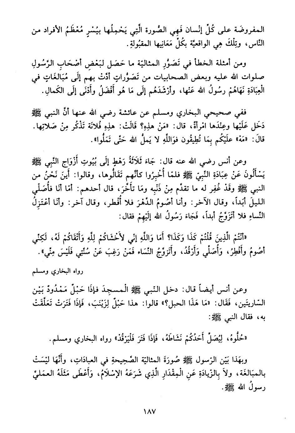 وبهذا بين الرسول صلى الله عليه وسلم صورة المثالية الصحيحة في العبادات، وأنها ليست بالمبالغة، ولا بالزيادة عن المقدار الذي شرعه الإسلام، وأعطى مثله العملي رسول الله صلى الله عليه وسلم.