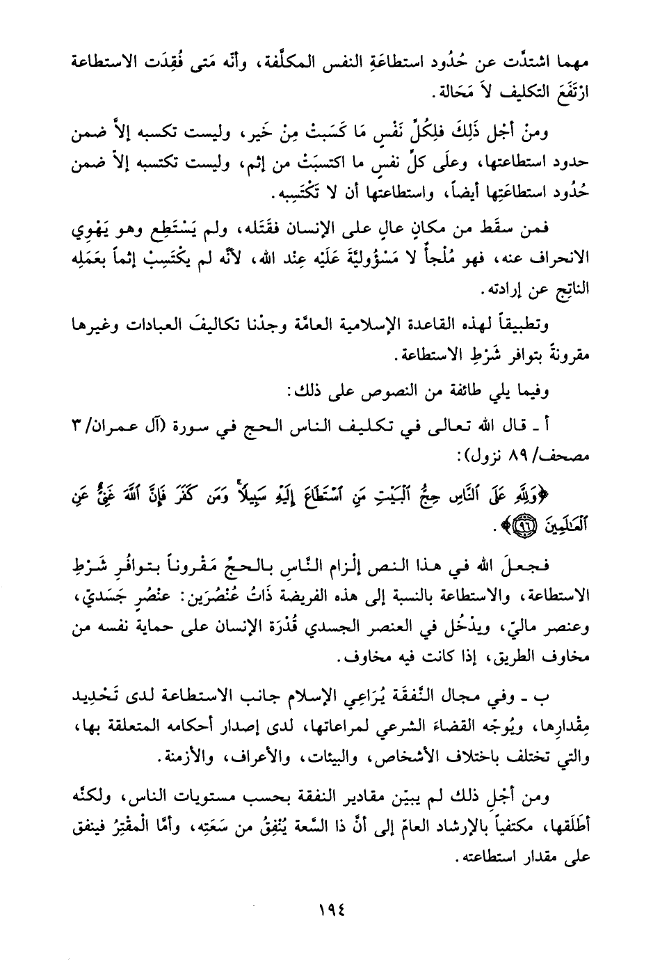 وتطبيقًا لهذه القاعدة الإسلامية العامة وجدنا تكاليف العبادات وغيرها مقرونة بتوافر شرط الاستطاعة.