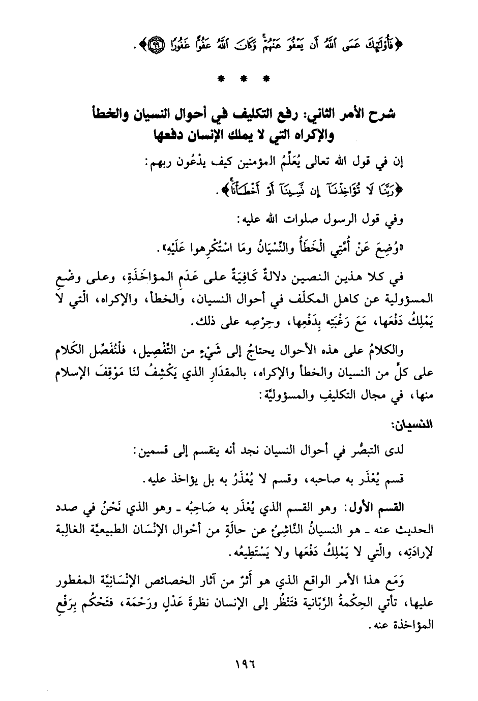 شرح الأمر الثاني: رفع التكليف في أحوال النسيان والخطأ والإكراه التي لا يملك الإنسان دفعها