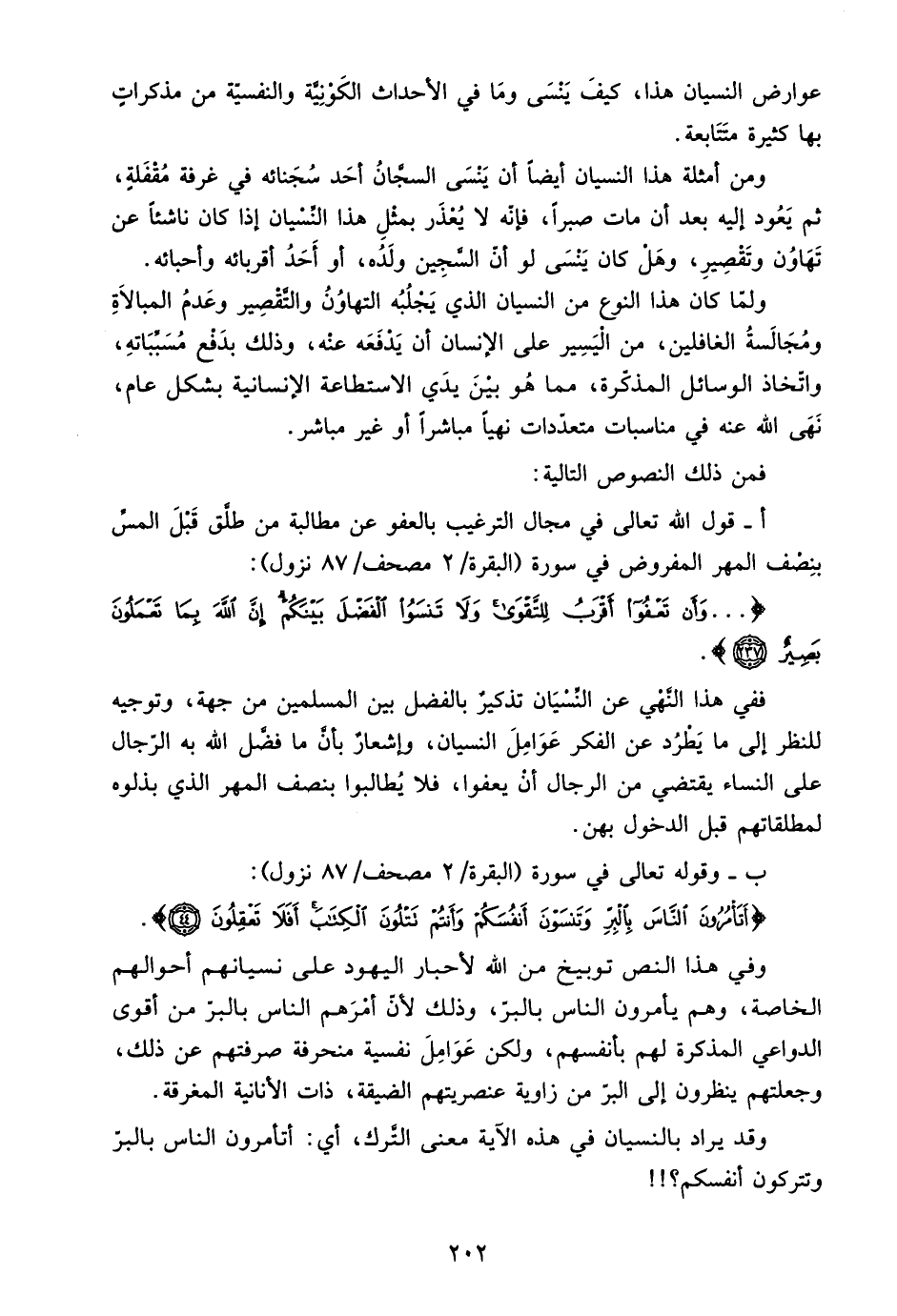 وفي هذا النص توبيخ من الله لأحبار اليهود على نسيانهم أحوالهم الخاصة، وهم يأمرون الناس بالبر، وذلك لأن أمرهم الناس بالبر من أقوى الدواعي المذكرة لهم بأنفسهم، ولكن عوامل نفسية منحرفة صرفتهم عن ذلك، وجعلتهم ينظرون إلى البر من زاوية عنصريتهم الضيقة، ذات الأنانية المغرقة.