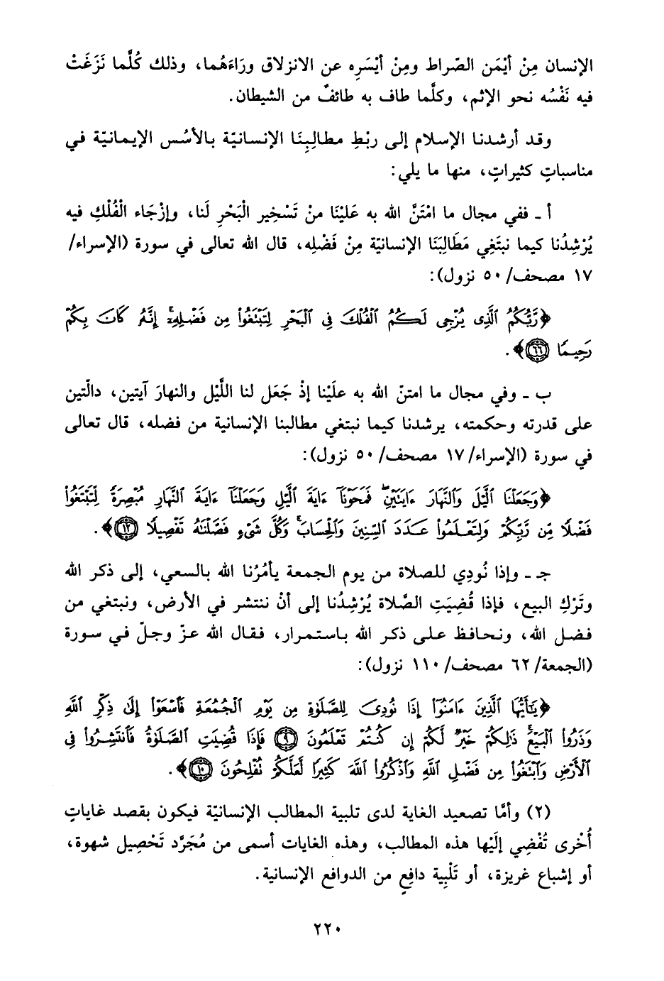 ب- وفي مجال ما امتن الله به علينا إذ جعل لنا الليل والنهار آيتين دالتين على قدرته وحكمته، يرشدنا كيما نبتغي مطالبنا الإنسانية من فضله، قال تعالى في سورة "الإسراء: 17 مصحف/ 50 نزول":